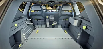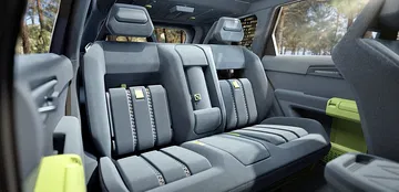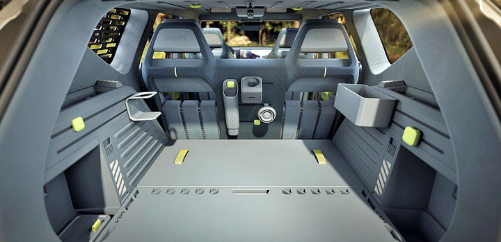 En el interior tenemos unos asientos que pueden girar, plegarse o convertirse en reposapiés. El azul Spruce y verde Citrus dan un toque muy colorido y por supuesto no faltan materiales sostenibles. La tapicería y otras partes del interior están hechos de tela transpirable y «bio PU», un material sintético derivado del poliuretano, pero más ecológico y hecho parcialmente a base de maíz. Y tiene soluciones muy ingeniosas, como el asiento desmontable para usar fuera del coche o la tapa del maletero que se transforma en mesa.