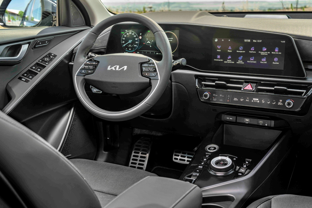 Tal vez sólo en algún punto de su zona trasera, como en el guarnecido de las puertas o en la calidad de la bandeja del maletero, se puede apreciar algo así, pero su habitáculo luce el característico diseño interior de Kia, marcado por un fuerte aire tecnológico gracias a la doble pantalla oculta bajo un mismo panel, la consola central y el mando de control del climatizador y diversos sistemas más.
