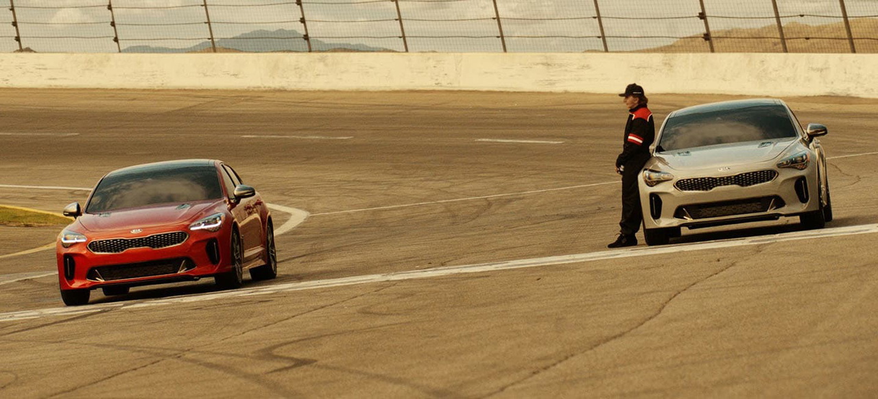 Adelanto del anuncio del KIA Stinger que se presentará en la final de la Super Bowl 2018, que tendrá como protagonistas al KIA Stinger, Emerson Fittipaldi, y otro piloto que aún no ha sido revelado.