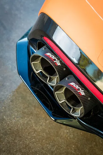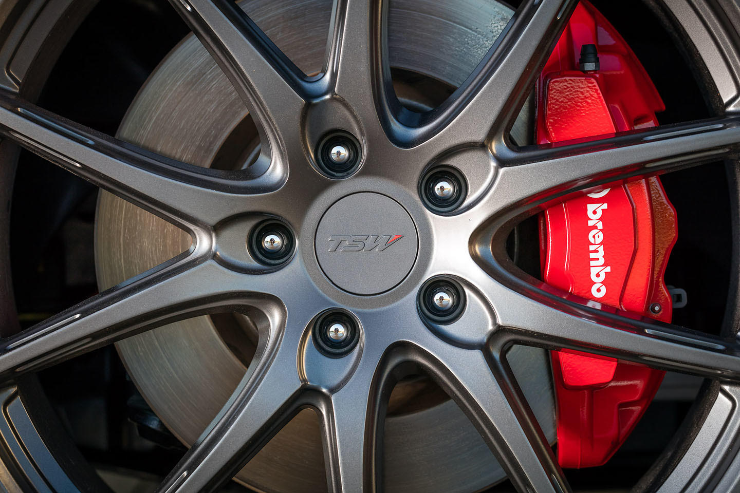 Su acabado de pintura naranja, unas llantas de 20″ de TSW, unos neumáticos Falken, suspensiones rebajadas con muelles Eibach, y otros detalles exteriores más, culminan un trabajo excelente.