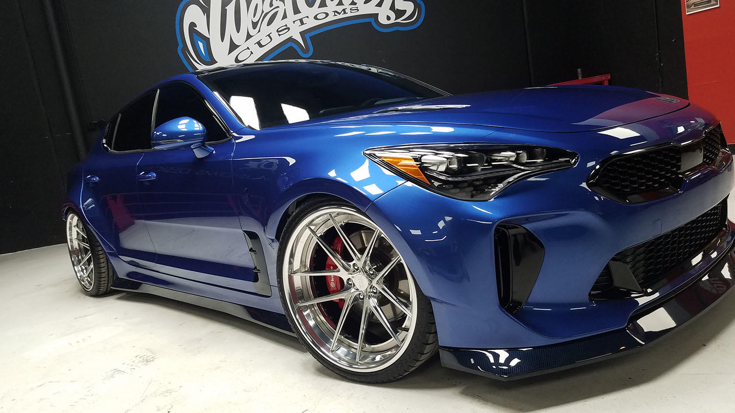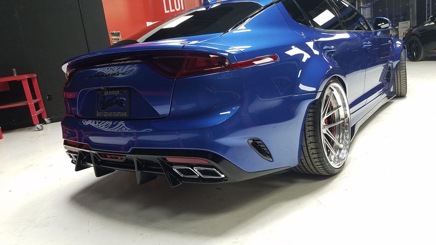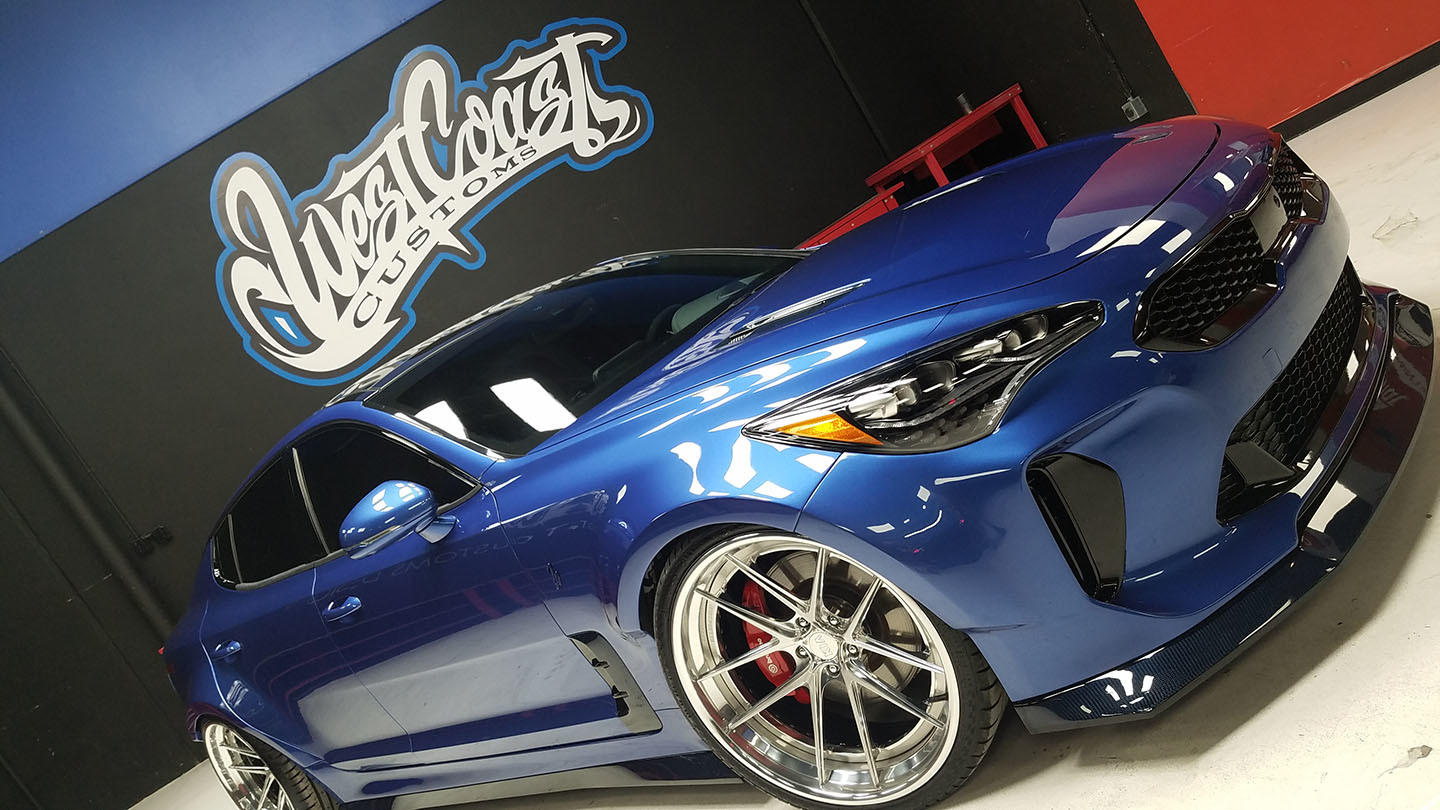 Más atrevido y exótico es el trabajo que West Coast Customs ha realizado sobre el KIA Stinger GT, el que vemos en esta galería en azul. El famoso taller de preparaciones californiano ha apostado por un diseño más extravagante, con llantas de 21″, suspensiones muy rebajadas, carrocería ensanchada y un kit exterior aerodinámico en fibra de carbono.