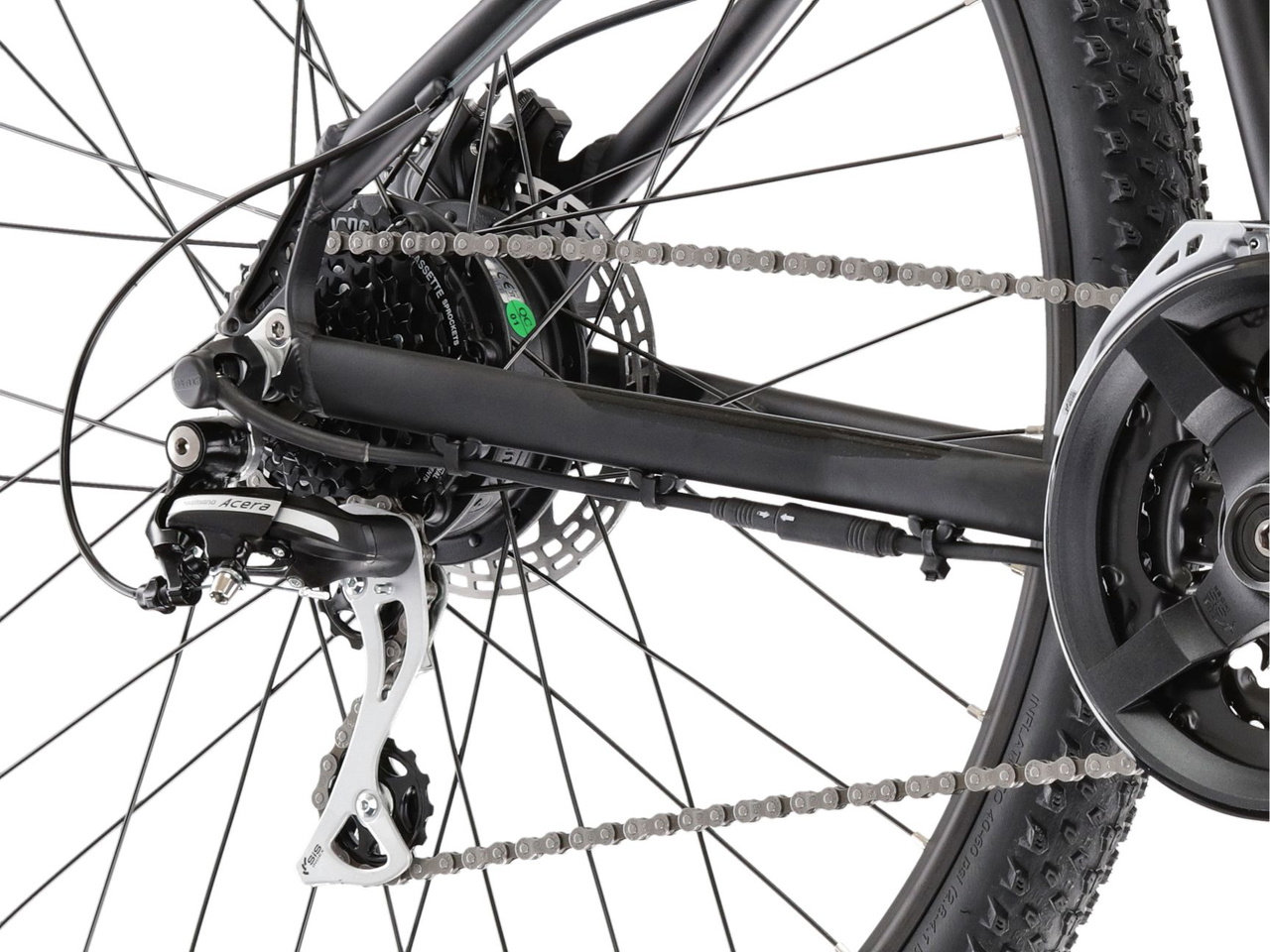 El corazón de la Kross Hexagon Boost 1.0 es un motor Bafang RM G120 250 DC alojado en el buje trasero. Este pequeño gigante ofrece 32 Nm de par motor, lo que te echará una mano a la hora de enfrentarte a cuestas y rutas largas regulando el esfuerzo. Es ideal para rutas MTB y largos caminos tranquilos. Este motor ofrece una ayuda justa sin ser invasivo, perfecto para quienes buscan iniciarse en el mundo eMTB pero sin perder la experiencia deportiva de utilizar una bicicleta para hacer ejercicio.