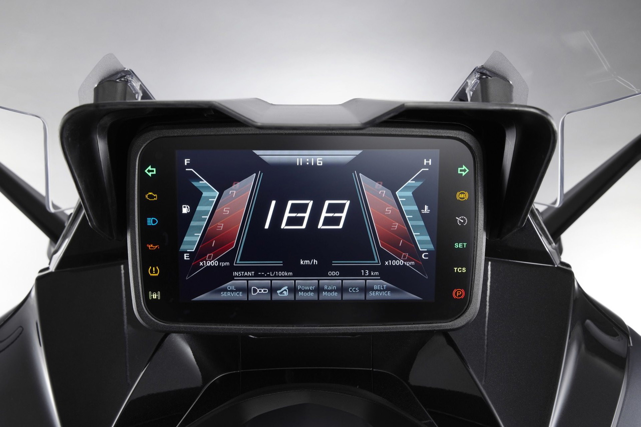 KYMCO estrena este modelo en España con un planteamiento premium y deportivo. Con chasis de aluminio, subchasis de doble viga y un sistema de doble eje delantero que la marca denomina KALS (KYMCO Advanced Leaning Suspension), presume de estabilidad y seguridad superiores, con la posibilidad de inclinar hasta 40 grados y un sistema de bloqueo de suspensión para las detenciones.
