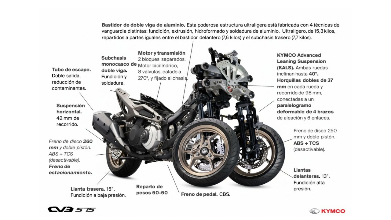 Si algo distingue a la KYMCO CV3 575 es su planteamiento premium y deportivo: bastidor de aluminio, subchasis de doble viga y una arquitectura delantera con doble eje que KYMCO denomina KALS (KYMCO Advanced Leaning Suspension), una solución específica del modelo asociada a un conjunto de patentes.