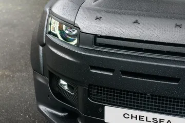 Basado en el Defender 90 P400 X-Dynamic – de 400 CV – parece que todos los esfuerzos los pusieron en dotar al nuevo Defender de una imagen más musculosa y oscura, con detalles en fibra de carbono, con nuevas defensas y faros más estrechos y alargados, y con elementos que ensanchan las aletas mucho más allá de lo necesario. Modificaciones que, más allá del empleo de un neumático todoterreno, o unas luces LED auxiliares en el techo, no parece que vayan a contribuir a una mejora de sus cualidades fuera del asfalto, sino todo lo contrario. Y apuntando a un 4×4 bruto, pero lastrado, que se debería sentir más cómodo aparcado frente a restaurantes de moda en Londres, que retozando en el barro de una trialera.