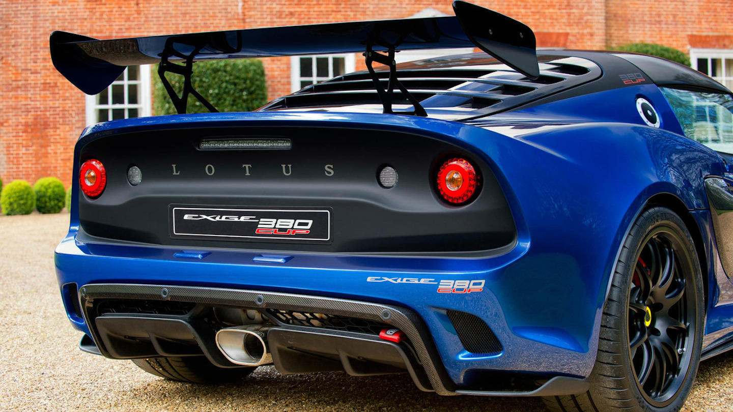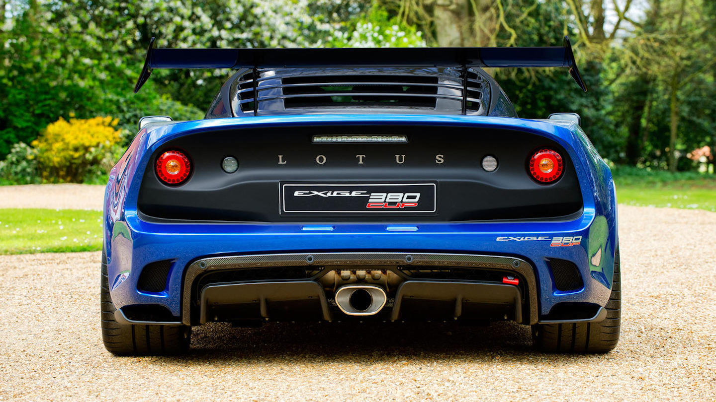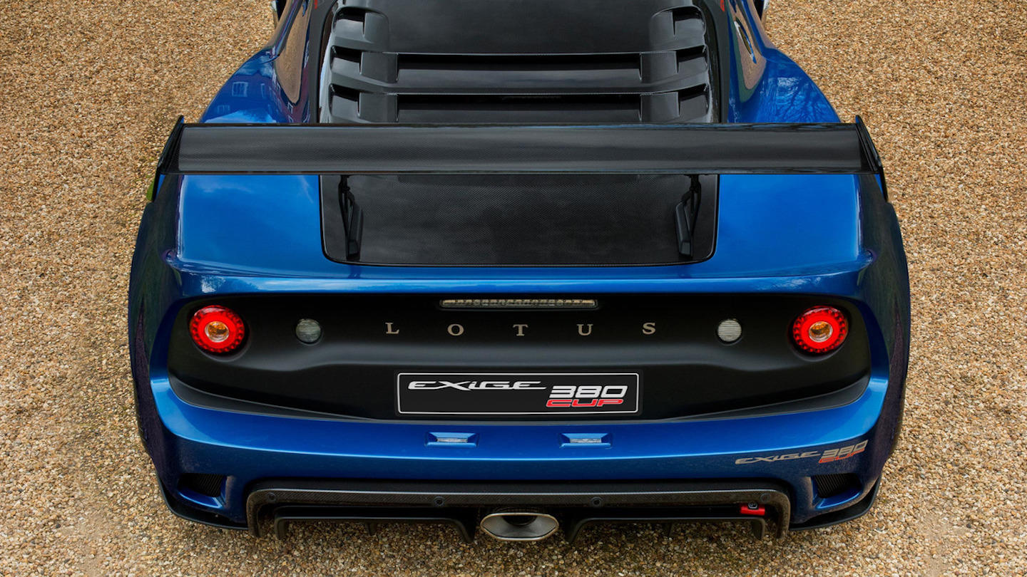 El Exige Cup 380 disfruta de una imagen aún más llamativa, fruto de un cuidado pack aerodinámico que, respecto al Exige Sport 380, añade unos remates en los bajos del paragolpes frontal más grandes, y, sobre todo, una parte trasera más elaborada, en la que destaca rápidamente el poderoso alerón, con amplias posibilidades de ajuste, y un paragolpes plagado de salidas de aire. El sistema de escape, fabricado en titanio -que es opcional y resta 10 kg-, está flanqueado por un gran difusor de fibra de carbono. Ambos componentes están compartidos con el Sport. El resultado son 200 kg de apoyo aerodinámico a máxima velocidad.