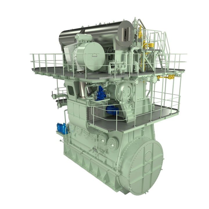 Este bichaco se llama MAN B&W 12G95ME-C10.5-LGIM. Es un motor de 2 tiempos que alcanza su máxima potencia a «solo» 80 revoluciones por minuto. ¿Qué problema trata de solventar? Las malditas emisiones, cambiando el diésel por metanol.