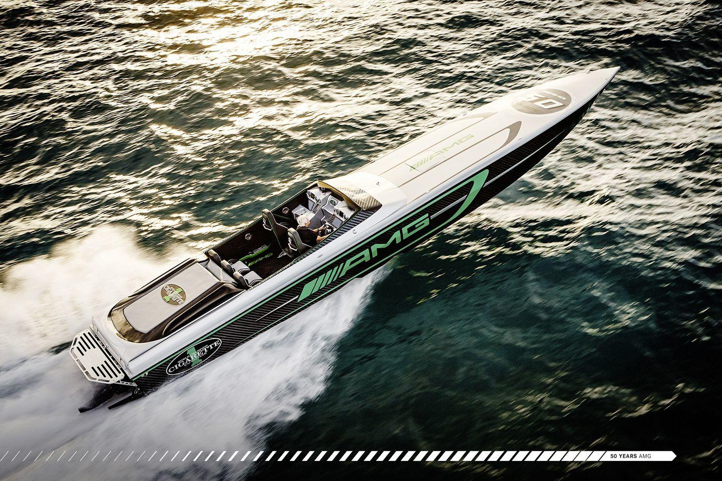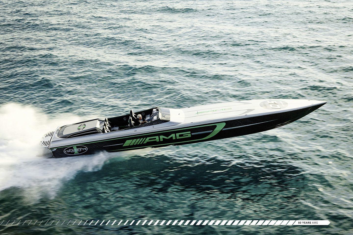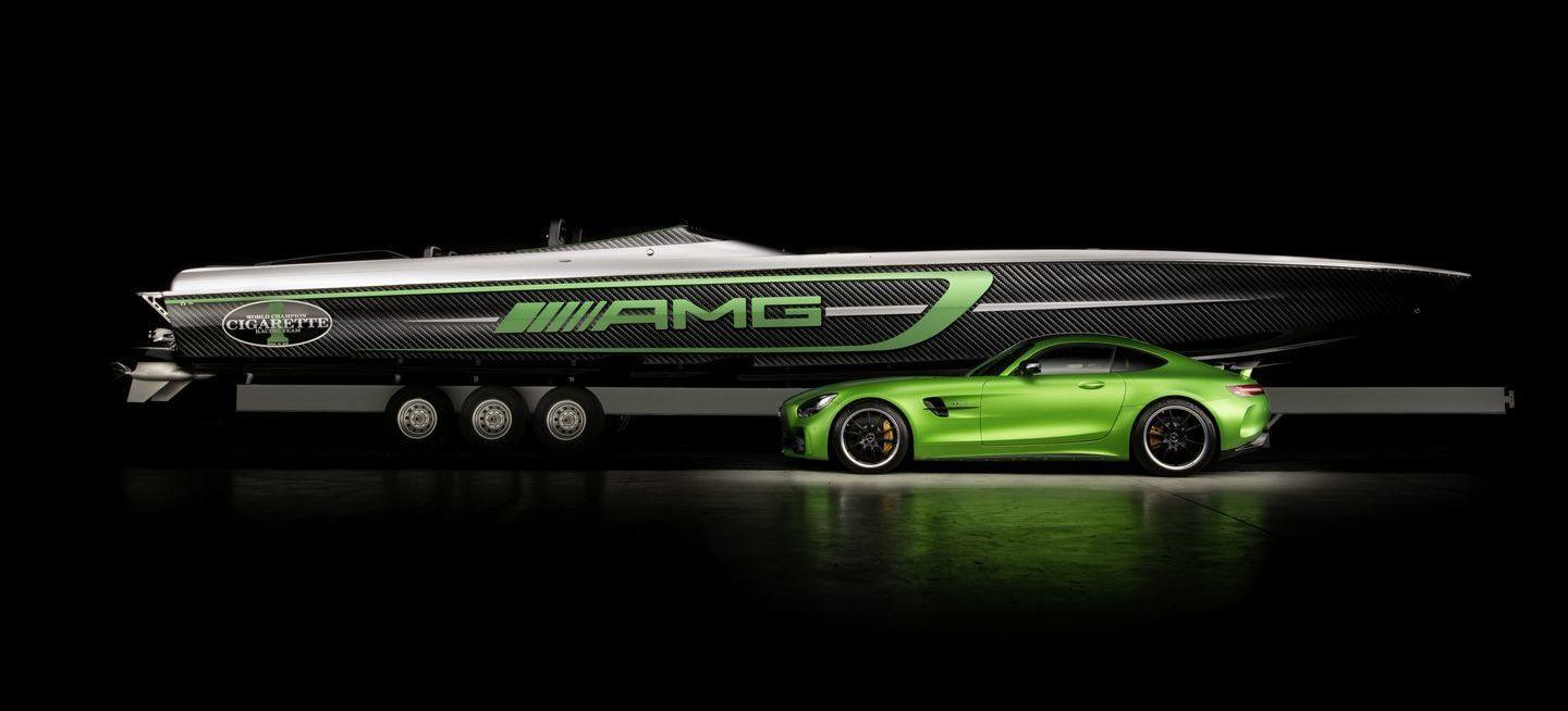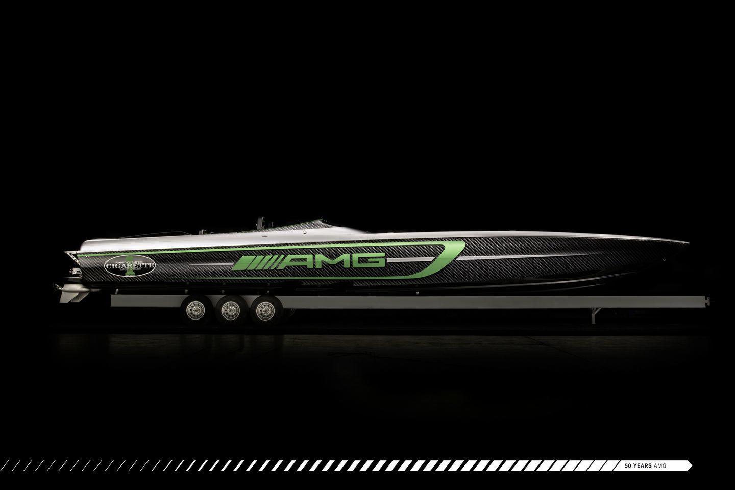Construido por Cigarette Racing, se ofrece en dos esloras, 15,24 metros y 10,66 metros – 50 y 35 pies, respectivamente. Su afiladísma forma rompe la superficie del mar como un bisturí, y lo hace dejando una fuerte impresión visual en todos sus espectadores. Se inspira en el Mercedes-AMG GT R, en cuya decoración aplica su color verde tan característico. Otro elemento común entre ambas máquinas es el uso extensivo de fibra de carbono. Partes del casco, el cockpit y la bahía de motores de la lancha han sido construidas íntegramente en fibra de carbono. Del precio de la lancha ni hablamos, no se ha comunicado y nos da miedo preguntar.