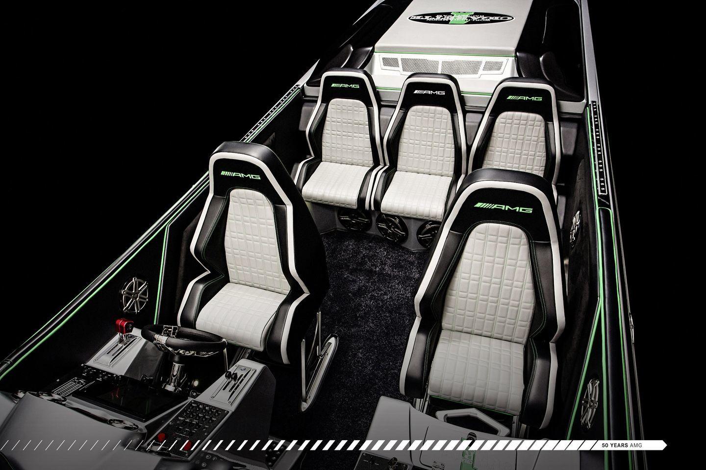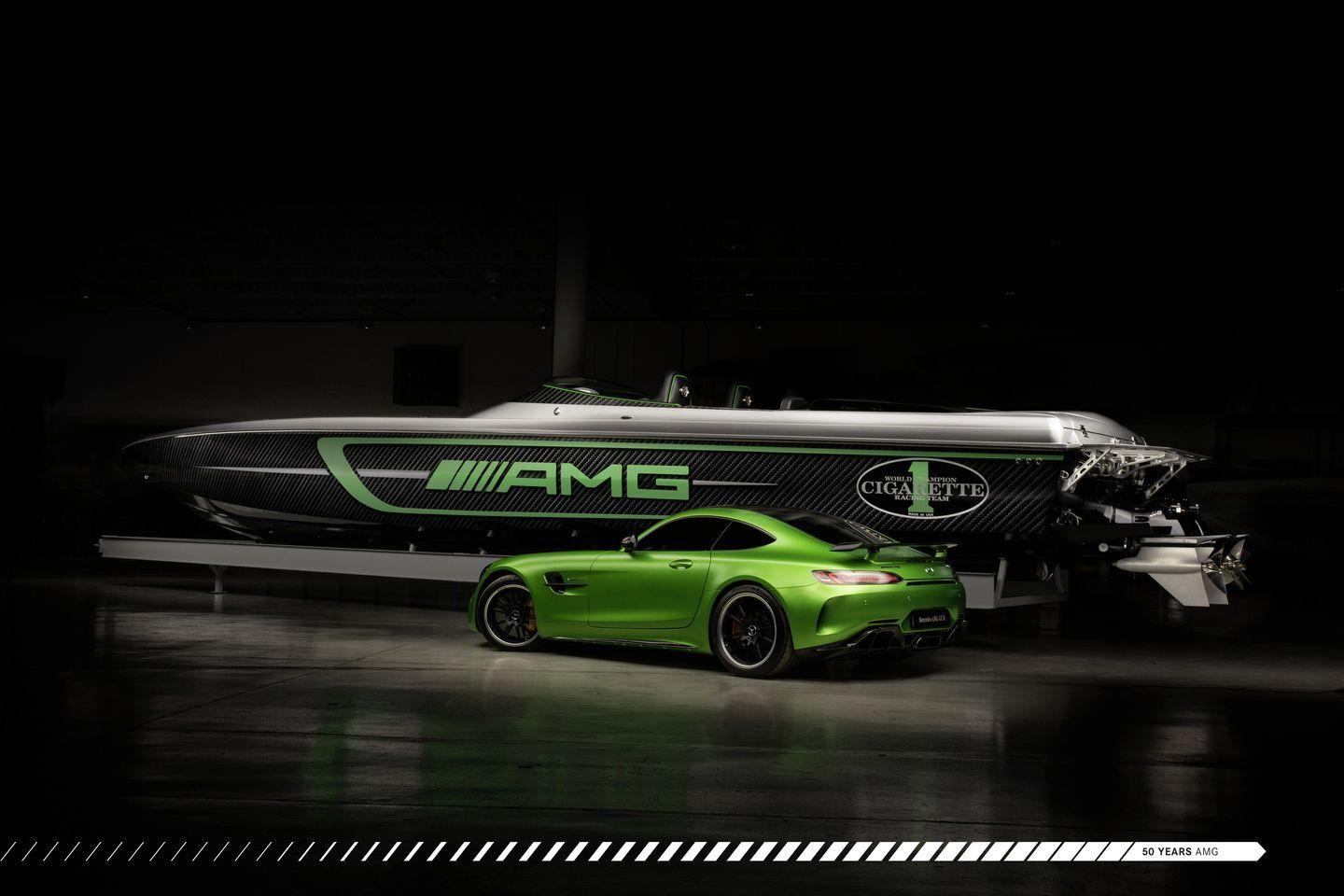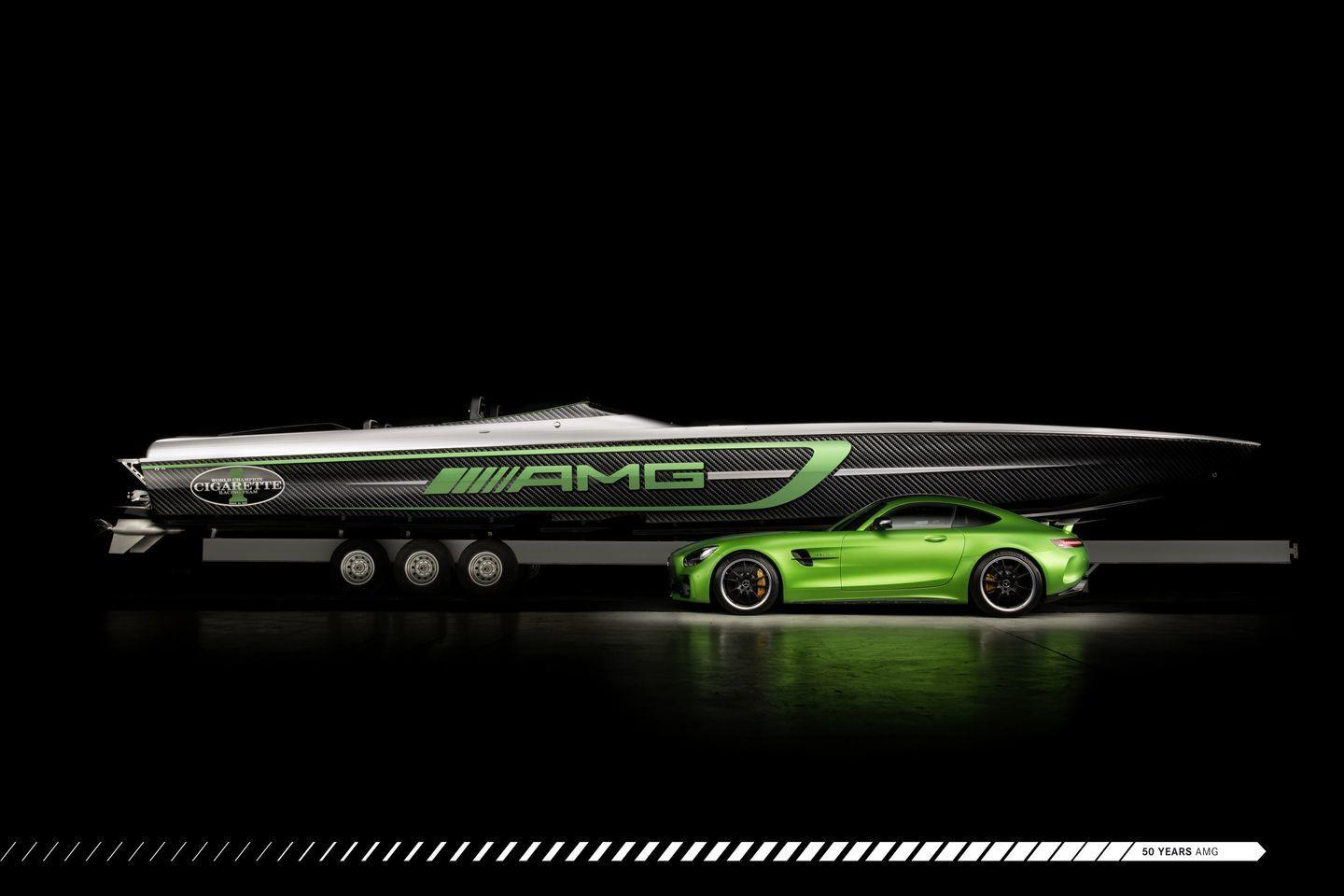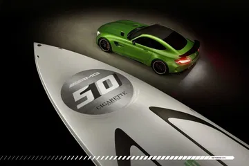 Construido por Cigarette Racing, se ofrece en dos esloras, 15,24 metros y 10,66 metros – 50 y 35 pies, respectivamente. Su afiladísma forma rompe la superficie del mar como un bisturí, y lo hace dejando una fuerte impresión visual en todos sus espectadores. Se inspira en el Mercedes-AMG GT R, en cuya decoración aplica su color verde tan característico. Otro elemento común entre ambas máquinas es el uso extensivo de fibra de carbono. Partes del casco, el cockpit y la bahía de motores de la lancha han sido construidas íntegramente en fibra de carbono. Del precio de la lancha ni hablamos, no se ha comunicado y nos da miedo preguntar.