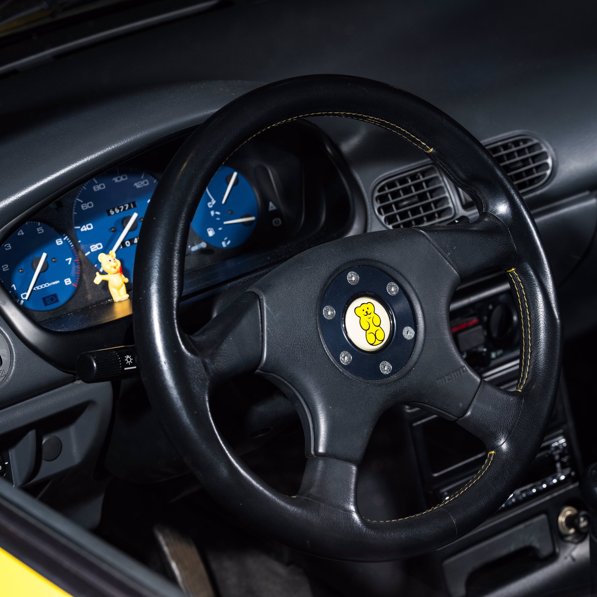 Empezando por el exterior, se le instalaron unos tapacubos que recuerdan a las famosas llantas Ronal Teddy Bear. La pintura especial seleccionada fue un brillante amarillo-dorado y contrastaba con el techo de lona negro corredizo que ocupaba todo el techo. Así que sí, podías ir dando la nota por la calle y que todos te vieran dentro de esta «pelotilla».