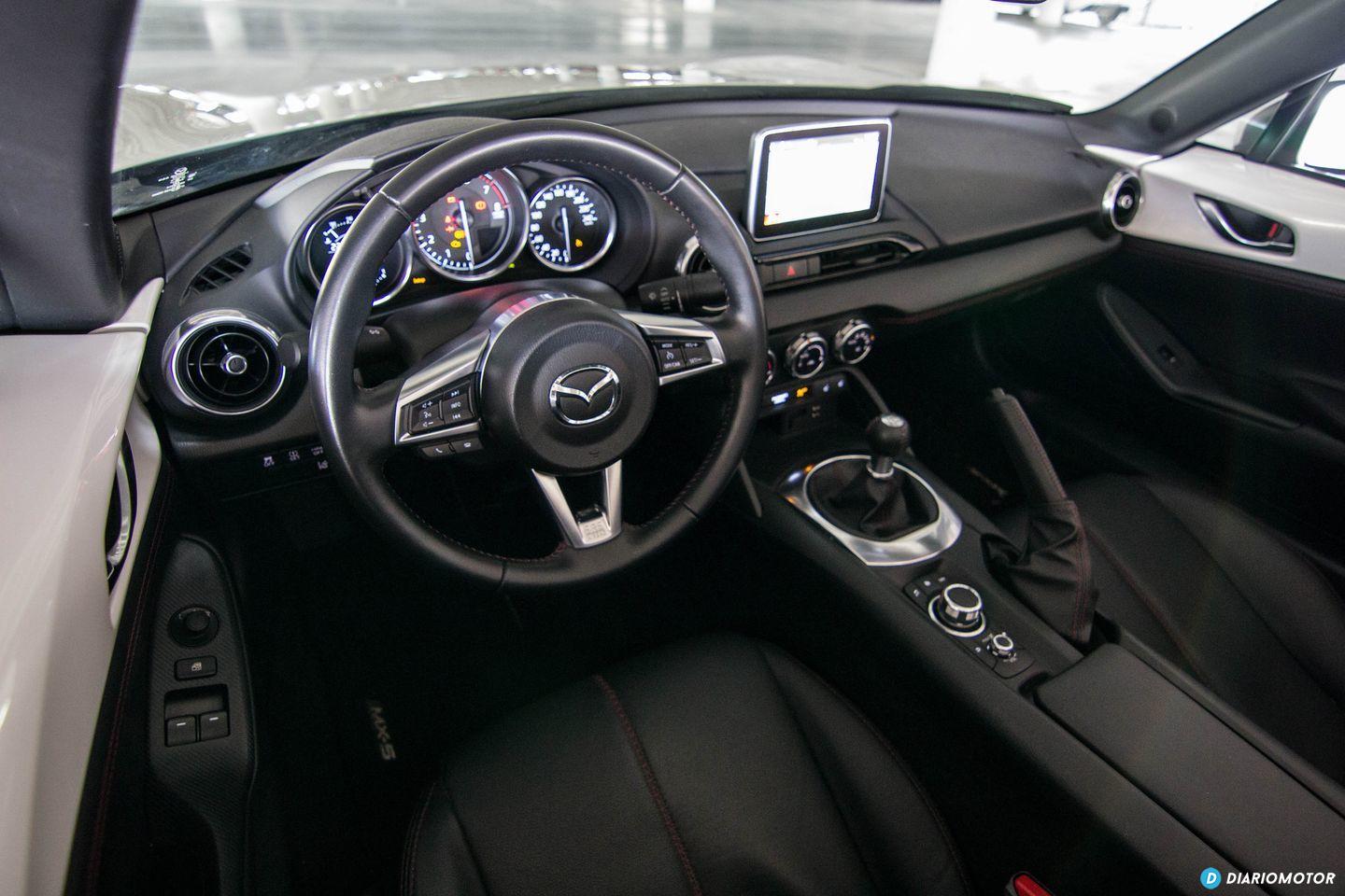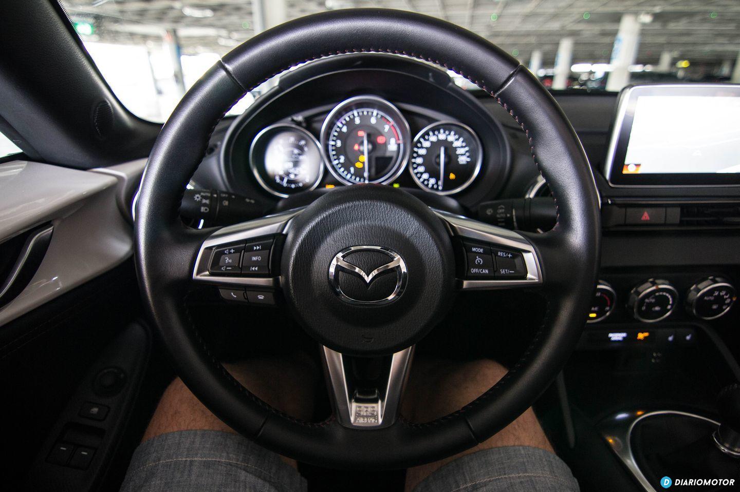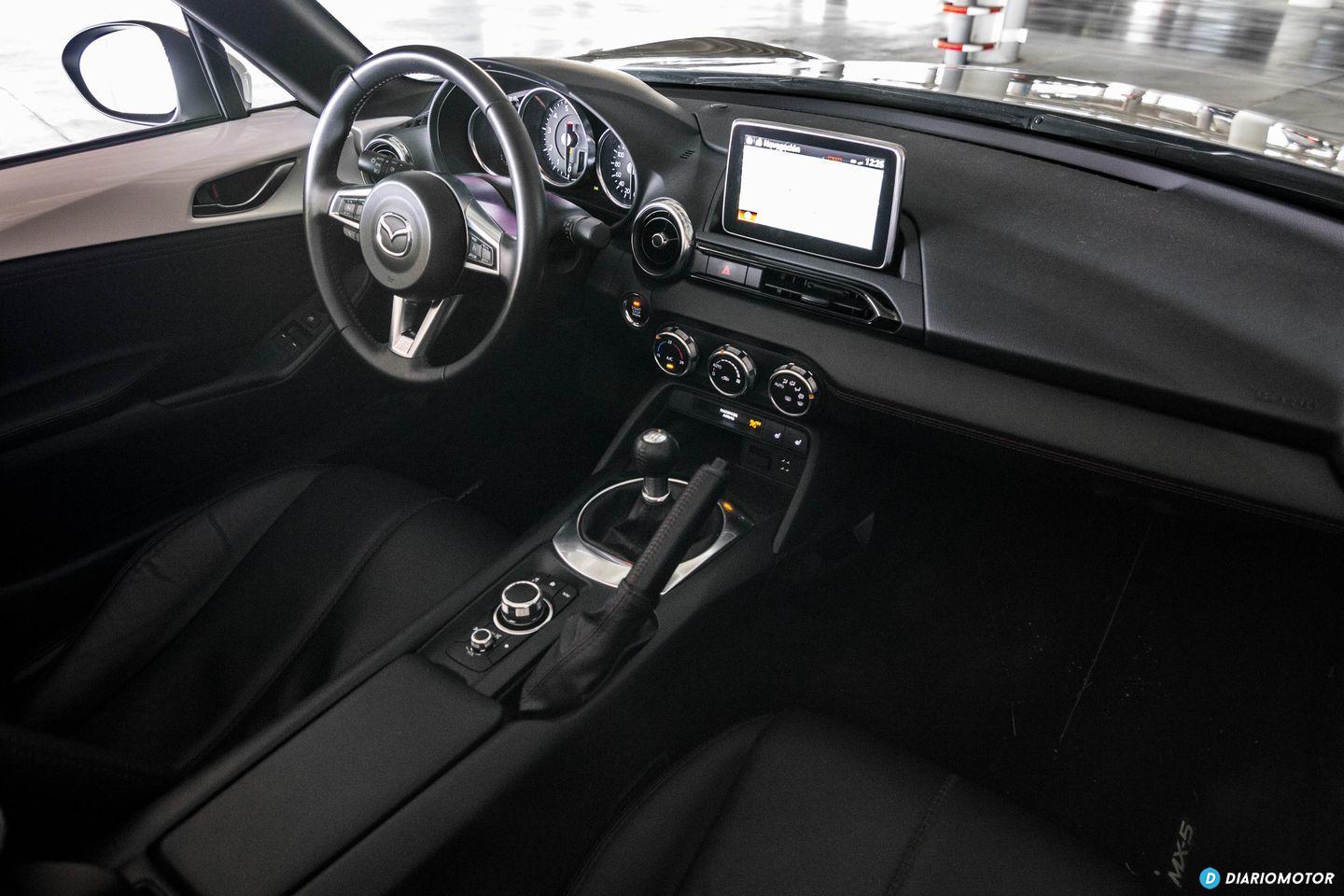 Estoy sentado casi a ras de suelo, y el Renault Twingo que se acaba de parar a mi lado parece de repente un Toyota Land Cruiser. El Mazda MX-5 no tiene un habitáculo amplio, pero voy cómodo a pesar de medir 1,83 metros y no ser precisamente una sílfide. Voy cómodo, pero apenas tengo dónde dejar mis pertenencias: el espacio bajo el túnel central es realmente pequeño y en la guantera apenas caben un par de guantes. Deja algo más que un teléfono delante de la palanca de cambios, da una curva, y acabará entre tus pies.