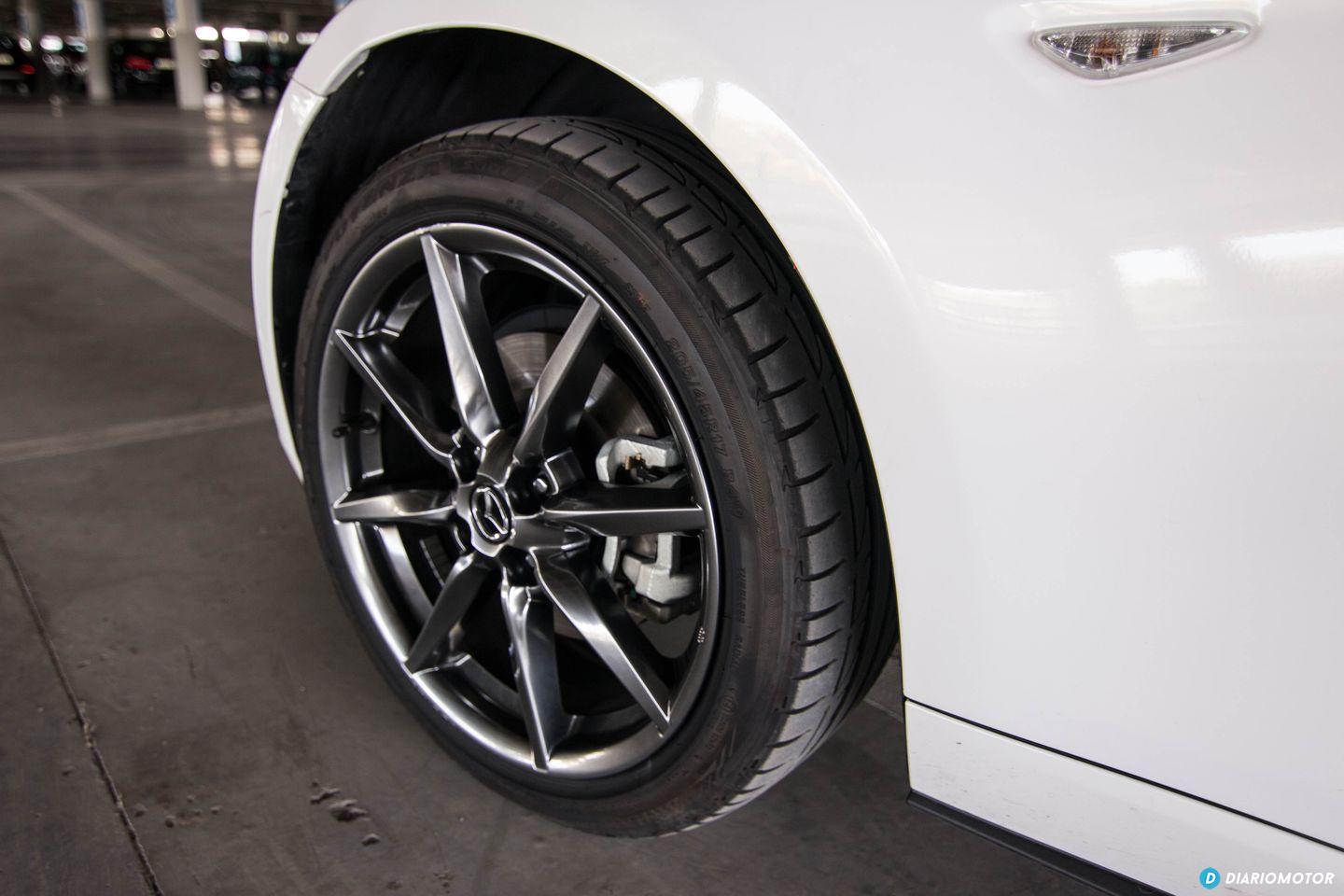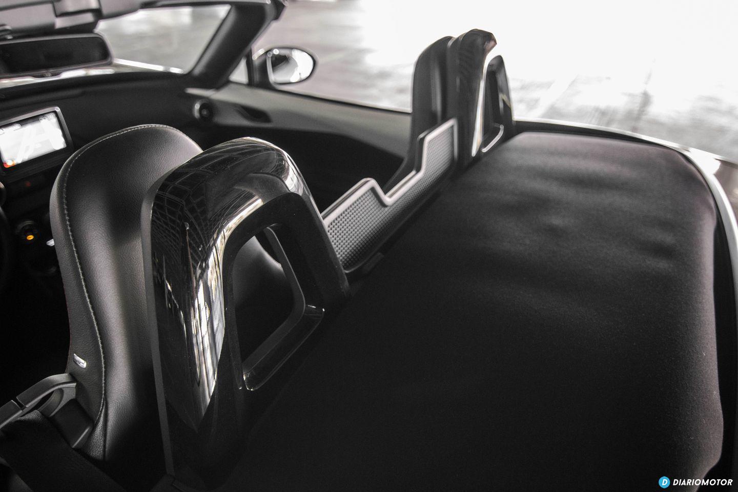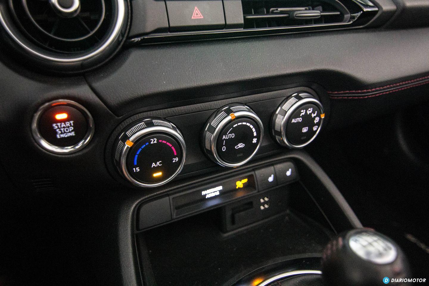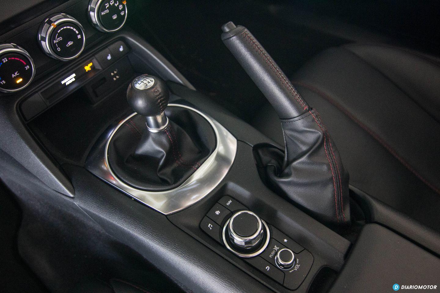 El Mazda MX-5 es un coche puro. Es un deportivo de sólo 3,92 metros de longitud, cuyo motor de cuatro cilindros propulsa el tren trasero, a través de una caja de cambios manual. En el caso de nuestra unidad, hablamos de un motor de 2,0 litros SKYACTIV-G, conectado a una caja de seis relaciones, con un autoblocante en el tren trasero. Por si fuera poco, monta una suspensión deportiva firmada por Bilstein. Es una verdadera golosina, y aunque es ligeramente más pesado que un 1,5 litros, sólo pesa 1.090 kilogramos.