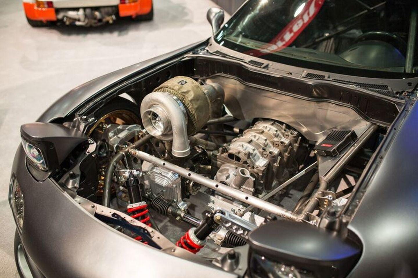 Los motores rotativos 13B de Mazda son modulares. El Mazda RX-7 montaba dos rotores en línea, con una cilindrada total de 1,3 litros, con doble sobrealimentación por turbocompresor. Lo que Rob Dahm ha hecho es juntar dos motores 13B, formando una bestia de cuatro rotores y 2,6 litros de cubicaje, en este caso sobrealimentada por un gigantesco turbocompresor Garrett de 98 mm de diámetro, recién desarrollado por el especialista. El turbo sería capaz de aportar 2.500 CV de potencia al motor, pero el objetivo de Rob Dahm no es tan elevado.