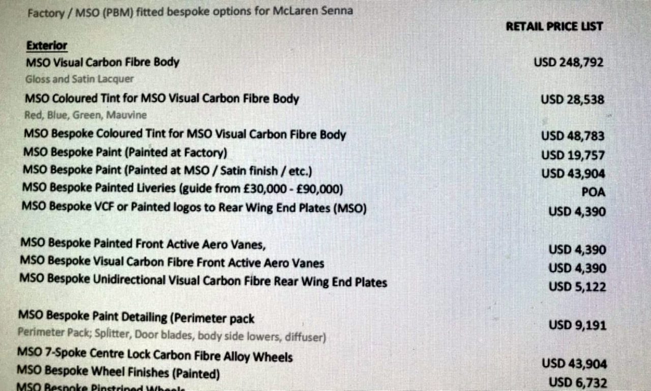 Hablar de configurar superdeportivos implica una lista de opcionales con precios desorbitados. Si las opciones estándar saben a poco y queremos ir un paso más allá en la personalización, McLaren pone a disposición los servicios de MSO. Un usuario de Instagram, coleccionista de coches y que ya espera a que llegue a su garaje uno de las 500 unidades del Senna, publicó hace poco las opciones de McLaren Special Operations disponibles para el Senna y, efectivamente, algunas cifras son mareantes.