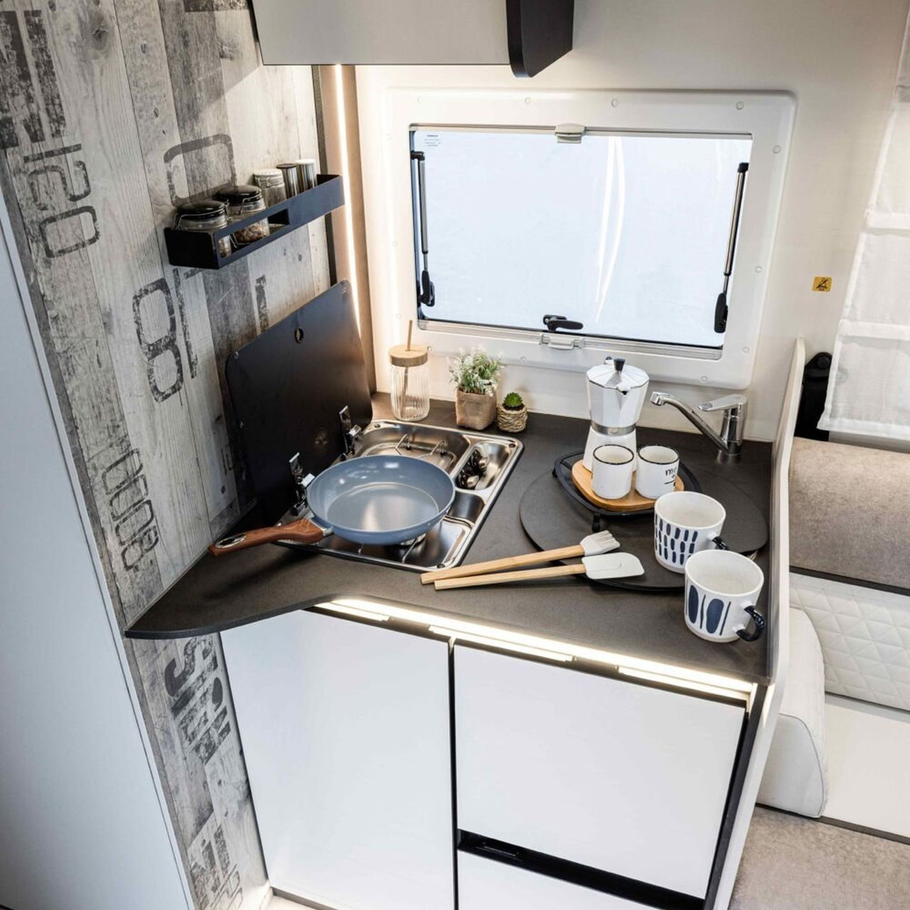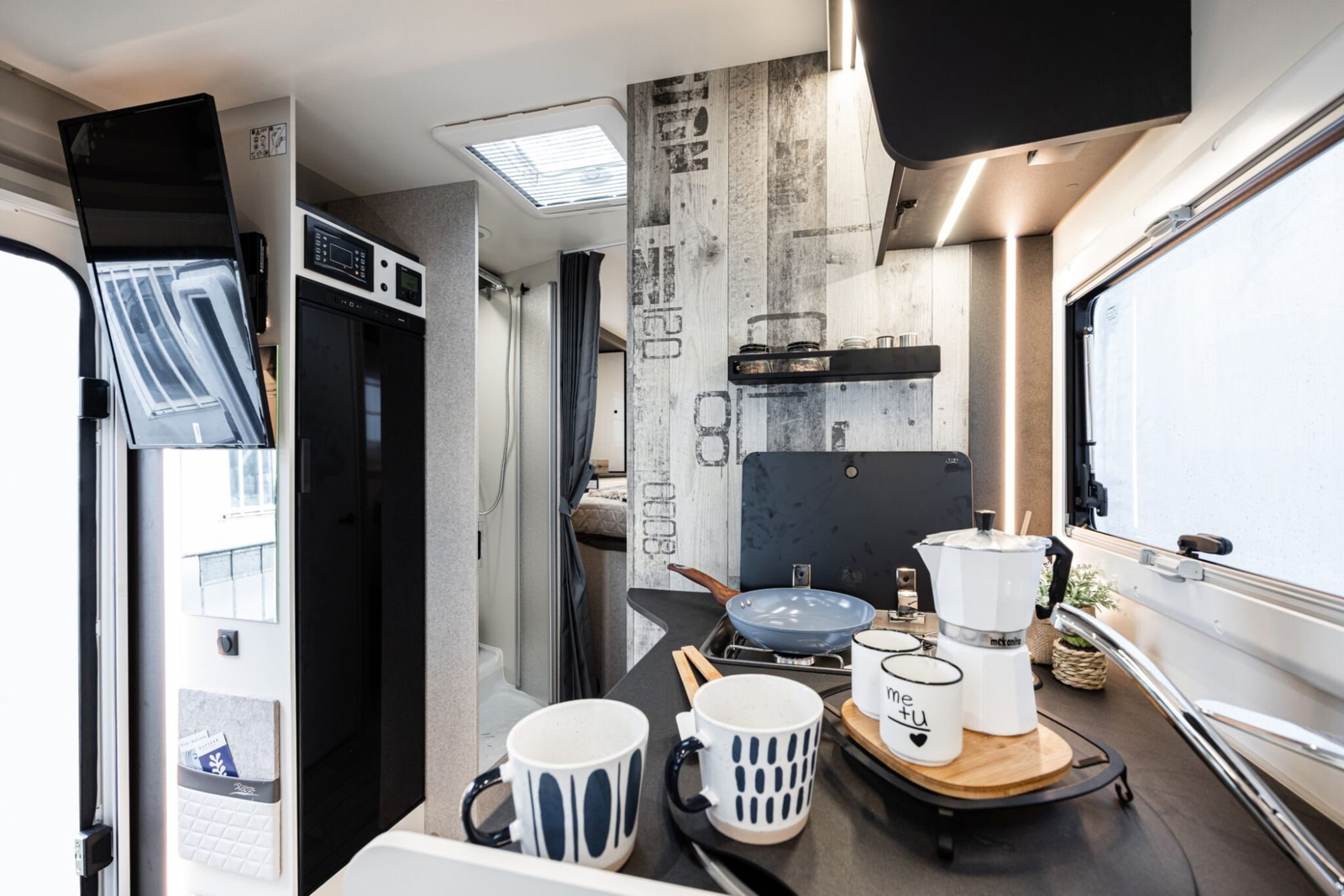 Completando la dotación encontramos la calefacción Truma Combi 4 a gas, soporte para televisión de 32 pulgadas, panel de control CP Plus, gestión electrónica para dos baterías de gel o litio, puerta de vivienda XL, mosquiteras y oscurecedores en ventanas, toma de gas exterior, ducha en garaje, espacio para dos bombonas de gas de 11 kg, tres claraboyas, placa solar de 200 w con regulador MPPT, toldo de color antracita, ventanas Seitz con marco en negro, etc.