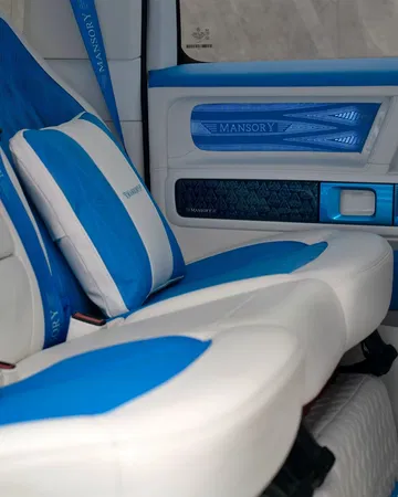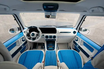 Los faros de serie no eran suficientes, así que le han puesto también seis faros auxiliares en el techo y más luces en el paragolpes delantero. Los icónicos escapes laterales los han hecho más grandes y están más cerca del suelo, consecuencia de poner unos estribos más bajos. Como los G 63 normales están muy vistos, a este le han puesto unas puertas traseras de apertura inversa (tipo Rolls-Royce), que dan paso a un interior de absoluta fantasía.