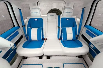 El interior combina el blanco y el azul, con detalles en azul brillante incluso en las salidas de aire y los mandos del salpicadero. Hay piel con patrón de rombos en algunas partes, con otras superficies de piel lisa. En la consola central, el volante, las puertas y en los pedales tiene una moldura con un patrón con lo que parece un tipo de poliedro. Y como detalle curioso: el botón para arrancar el motor se ha movido al techo, por encima del retrovisor.