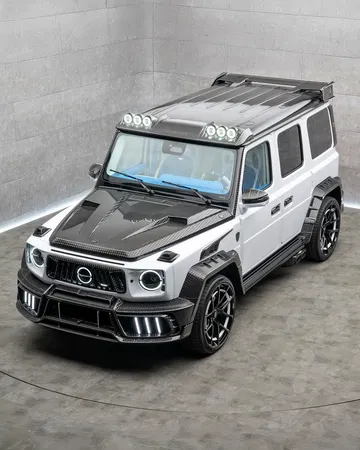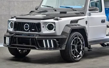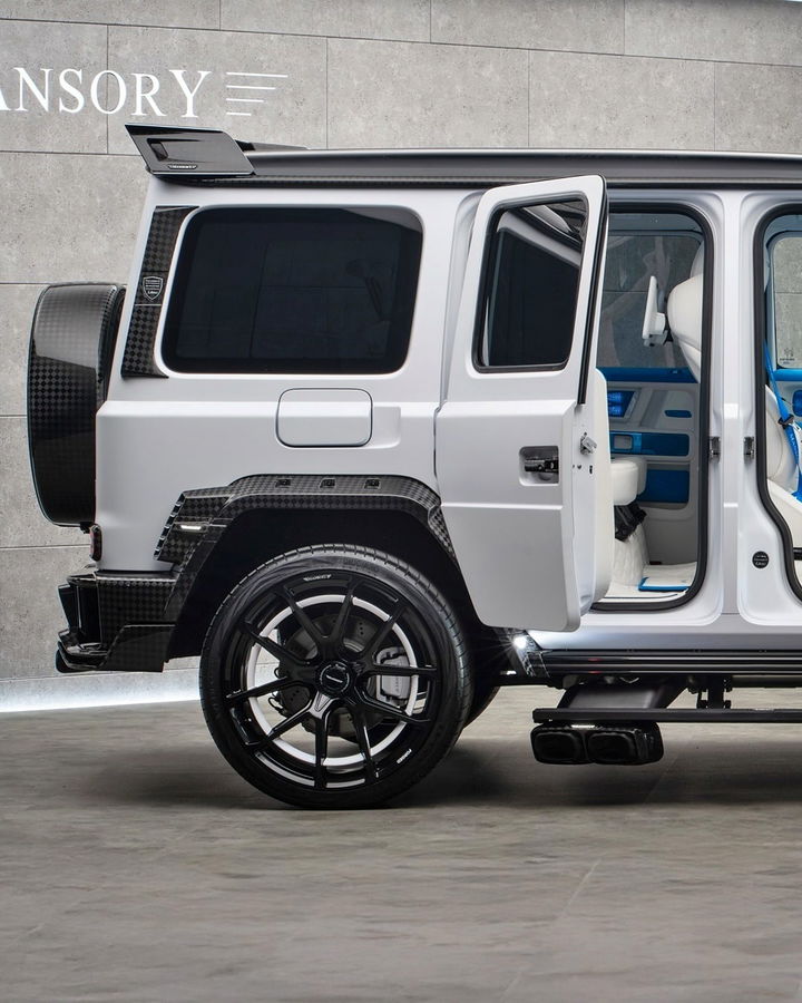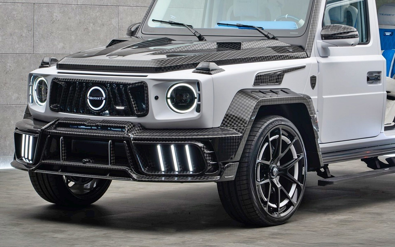 Mansory puede destacar por muchas cosas, pero la discreción no es una de ellas. Así que han cogido un G 63, le han puesto piezas de fibra de carbono en el capó, el paragolpes, las aletas, los espejos, el techo, las manillas de las puertas y el alerón, y después lo han pintado de blanco mate y le han puesto unas llantas forjadas absurdamente grandes con neumáticos de perfil mínimo.