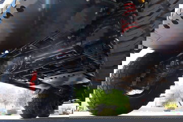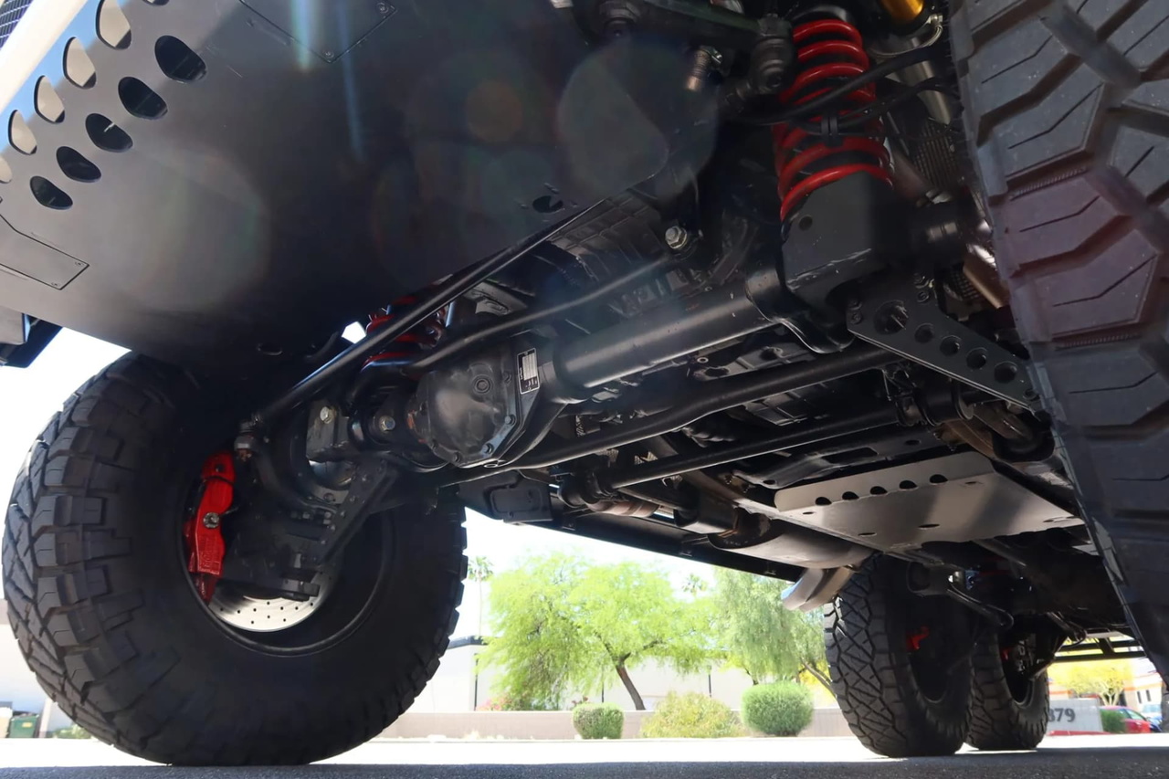 Lo primero que salta a la vista cuando te cruzas con un Mercedes-AMG G63 6×6 es el tamaño de sus seis (sí, seis) enormes ruedas (37 pulgadas) que, además, cuentan con suspensiones Öhlins y están equipadas con un sistema de hinchado y desinflado remoto. Su altura libre al suelo es, gracias a sus ejes rígidos especiales, de 46 centímetros (la original es de 21).