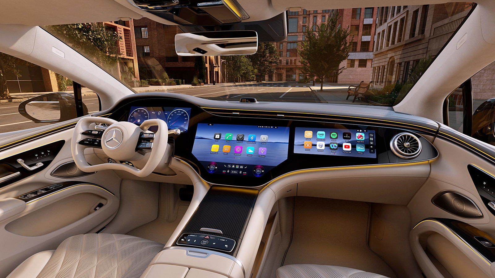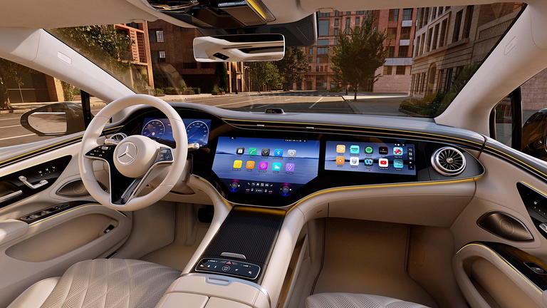 Por dentro sigue siendo una nave espacial. Sigue teniendo de serie la MBUX Hyperscreen de 55 pulgadas (repartidas en 3 pantallas de 12,3″ + 17,7″ + 12,3″), pero lleva un nuevo sistema operativo MB.OS. Aquí tenemos lo típico en cualquier coche moderno: asistente de voz con IA integrada para diálogos complejos y un superordenador conectado a la nube.