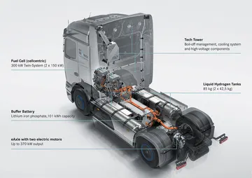 En lugar de un motor diésel, bajo la cabina lleva dos pilas de combustible BZA150, que se encargan de convertir el hidrógeno líquido en energía eléctrica. Tienen una potencia total de 300 kW (150 kW cada una). La electricidad que generan se acumula en una batería de respaldo con 101 kWh de capacidad y celdas LFP. Sí, es una batería grande, pero sigue siendo unas 4-5 veces más pequeña que la de un camión eléctrico de batería.
