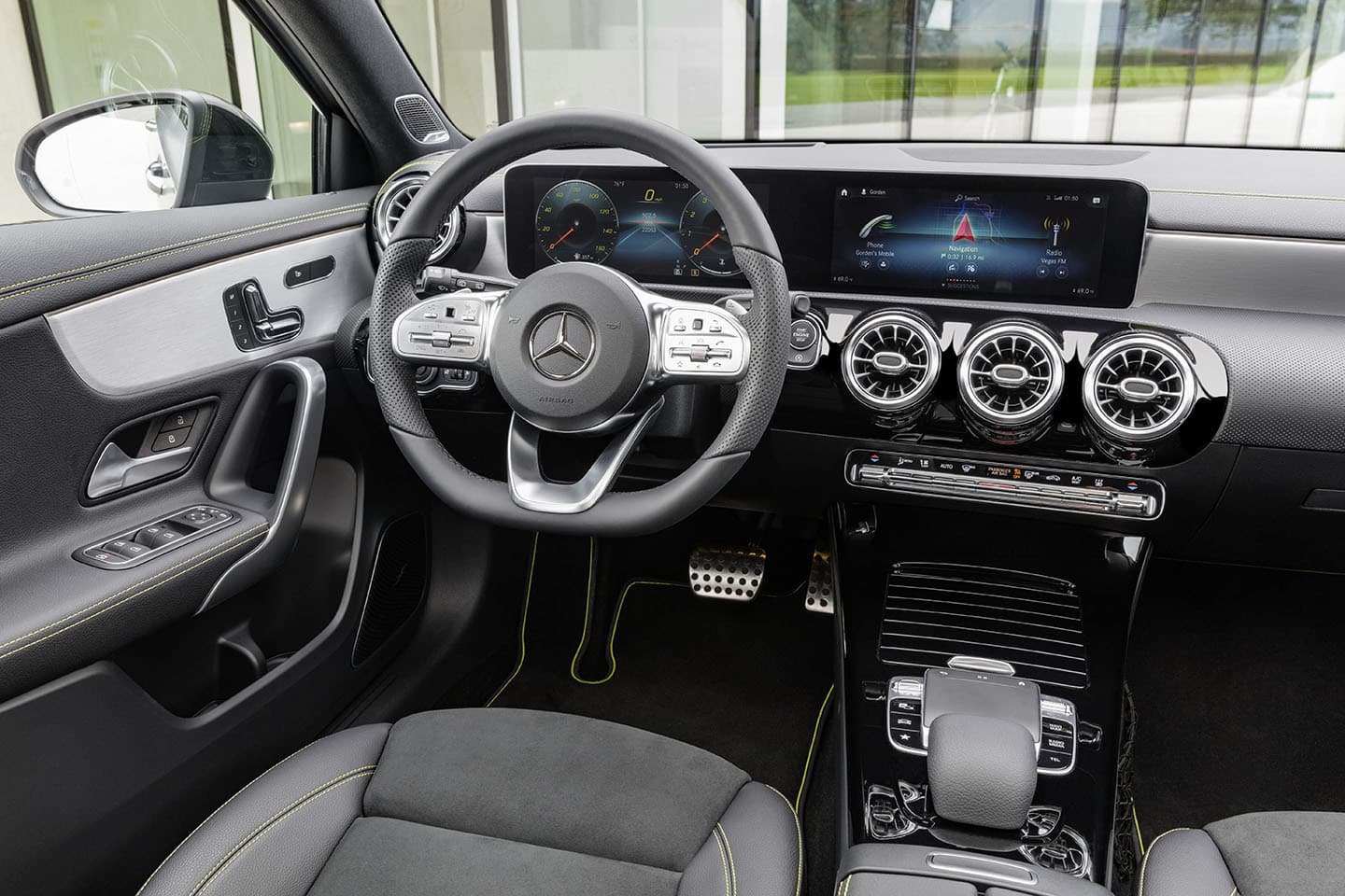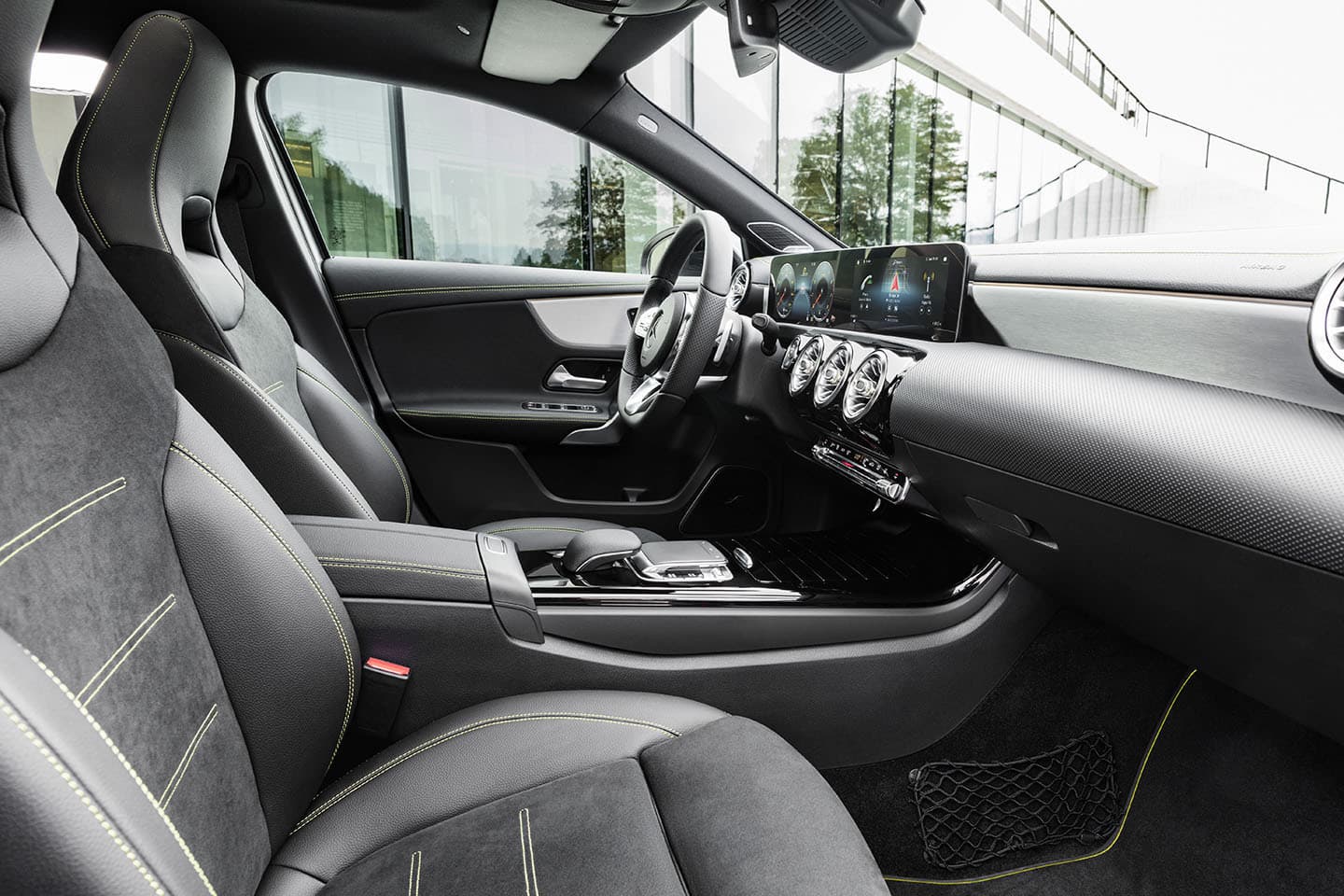 A bordo, el valor añadido del Mercedes Clase A Edition 1 corre a cargo de unos asientos deportivos, con el reposacabezas integrado en el propio respaldo, y tapizados mixtos de piel ARTICO y microfibra DINAMICA, costuras visibles en verde, inserciones cromadas en paneles, salpicadero y los conductos de ventilación del climatizador, volante deportivo y la iluminación ambiental estrenada por el Clase A, con 64 colores diferentes.