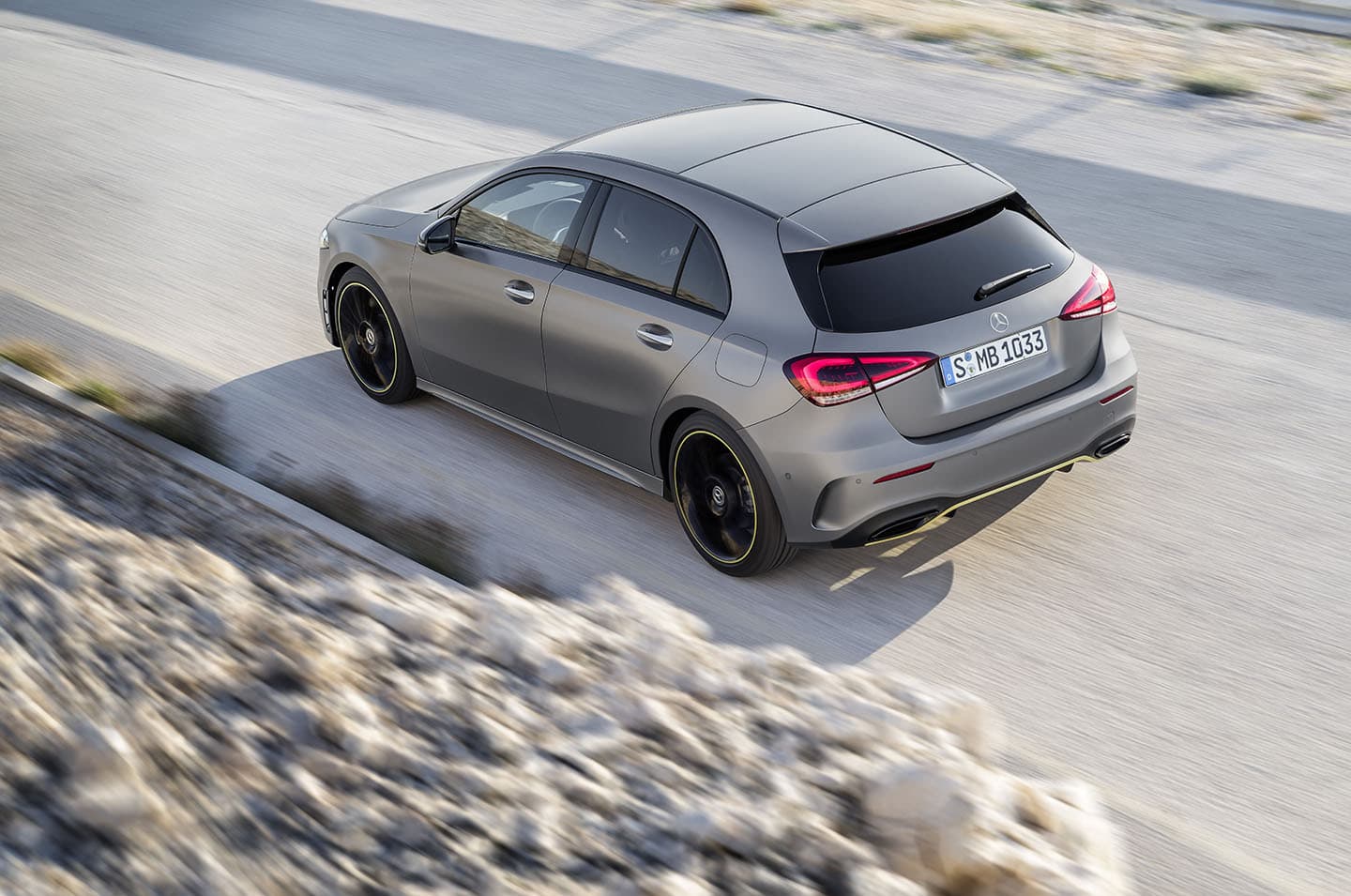 Aunque el Mercedes Clase A Edition 1 de estas imágenes aparezca con un acabado de pintura gris montaña designo, un acabado mate, esta es solo una de las múltiples opciones del Edition 1, que en realidad podrá configurarse en este acabado mate, o en cualquiera de los cuatro acabados metalizados y tres no metalizados que se ofrecen en el Clase A. Sí serán propios del Edition 1 los detalles en verde de la carrocería, en las defensas, y en el aro de las llantas negras de 19″ y diseño AMG que sí equipa de serie. Este Edition 1, de hecho, se deriva del paquete AMG Line del nuevo Clase A.