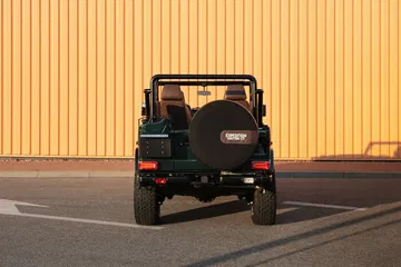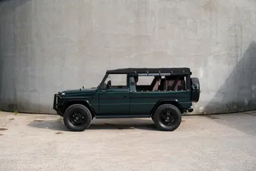 Por fuera, este Clase G luce una preciosa pintura verde oscuro que combina con detalles en negro, incluidas las llantas. Tiene una nueva defensa delantera y nuevos estribos laterales -también negros-, complementados con una moderna iluminación LED. Lleva dos arcos antivuelco y el techo es de lona y, por supuesto, desmontable.