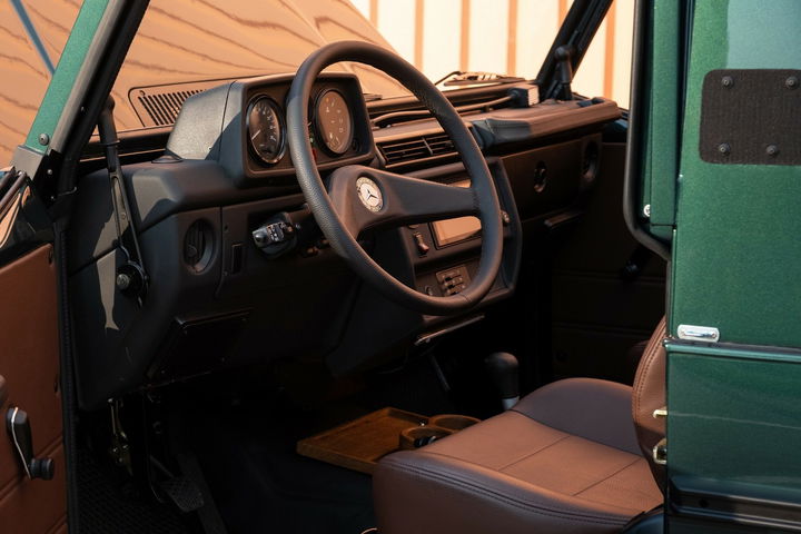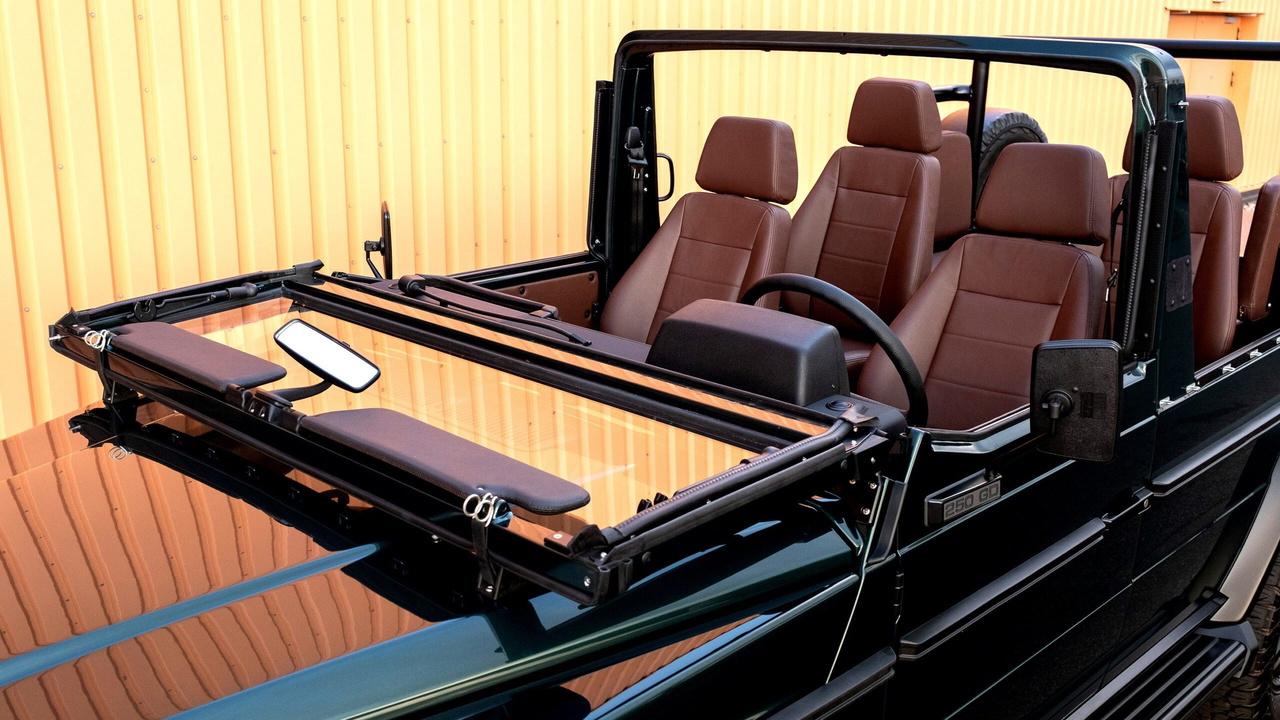 Por fuera, este Clase G luce una preciosa pintura verde oscuro que combina con detalles en negro, incluidas las llantas. Tiene una nueva defensa delantera y nuevos estribos laterales -también negros-, complementados con una moderna iluminación LED. Lleva dos arcos antivuelco y el techo es de lona y, por supuesto, desmontable.