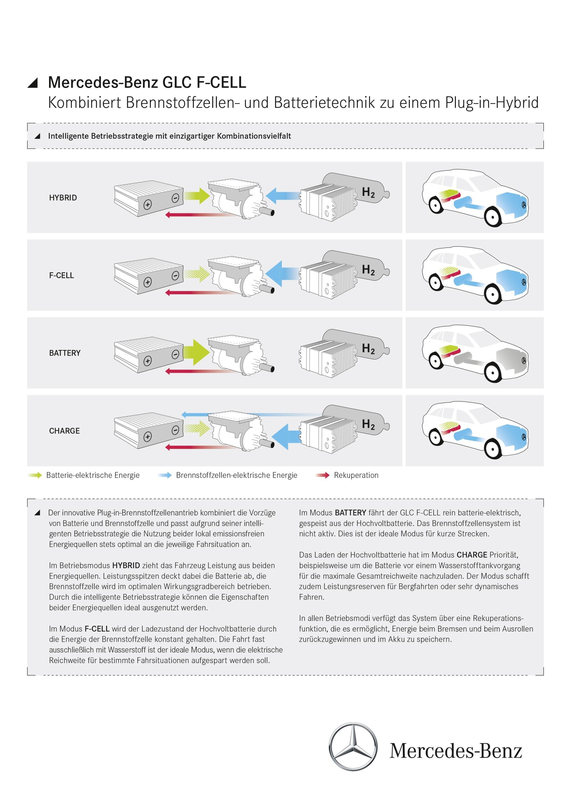 EL uso de estos dos sistemas de propulsión se gestiona a través de 4 modos de conducción, con un modo Hybrid en el que ambas mecánicas funcionan conjuntamente, un modo Battery en el que el GLC funciona sólo impulsado por la energía de las baterías de iones de litio; un modo F-Cell, que mueve nuestro GLC gracias únicamente al hidrógeno y un modo Charge que da prioridad a la recarga de la batería.