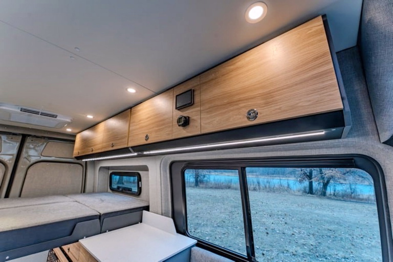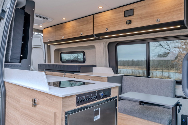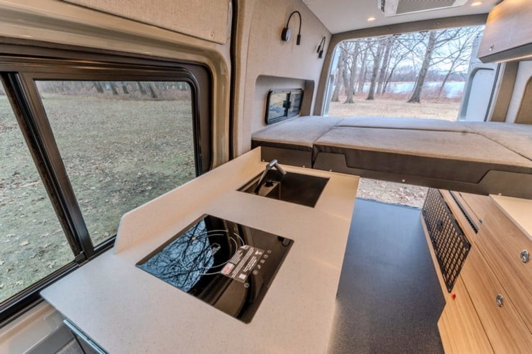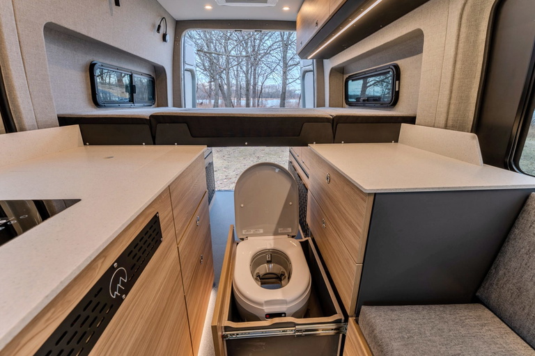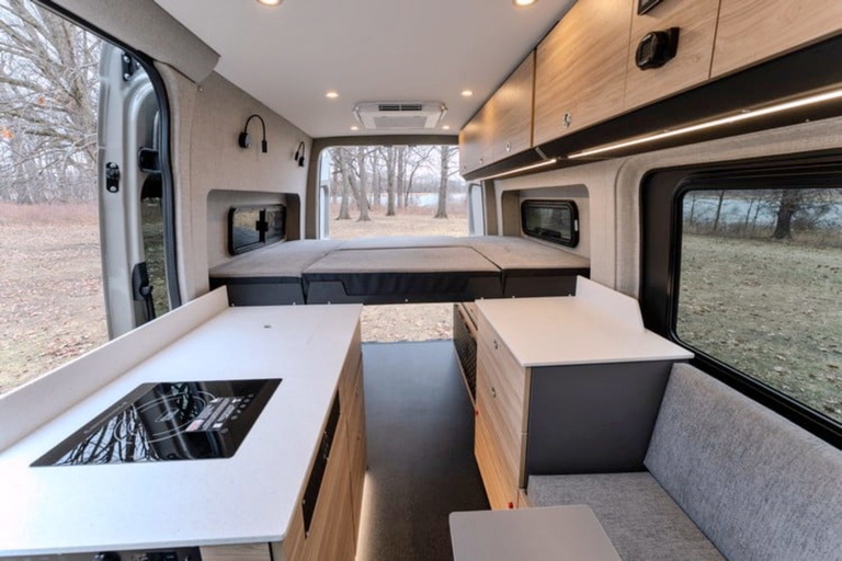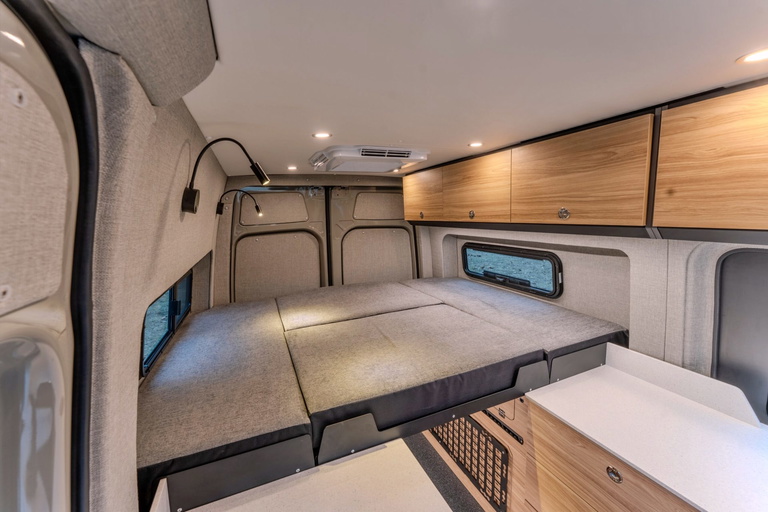 Si desapareces durante semanas cruzando Islandia (por mencionar un ejemplo), es fundamental no echar nada en falta. De día tienes un garaje donde meter bicicletas, tablas o incluso una moto. De noche, se despliega una cama abatible tipo Murphy con colchón viscoelástico y una cocina completa con placa de inducción, frigorífico de 130 litros accesible desde dentro y fuera, superficies plegables…