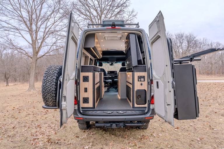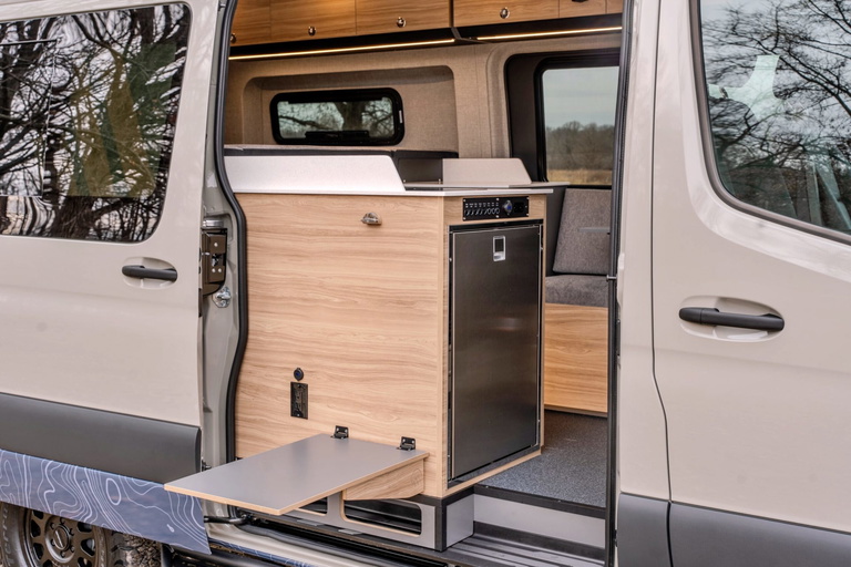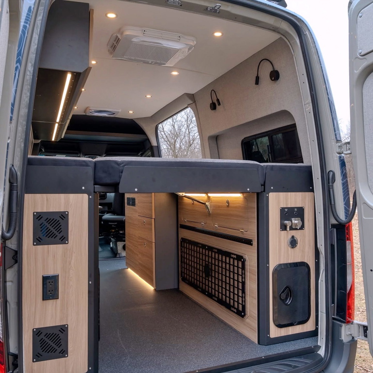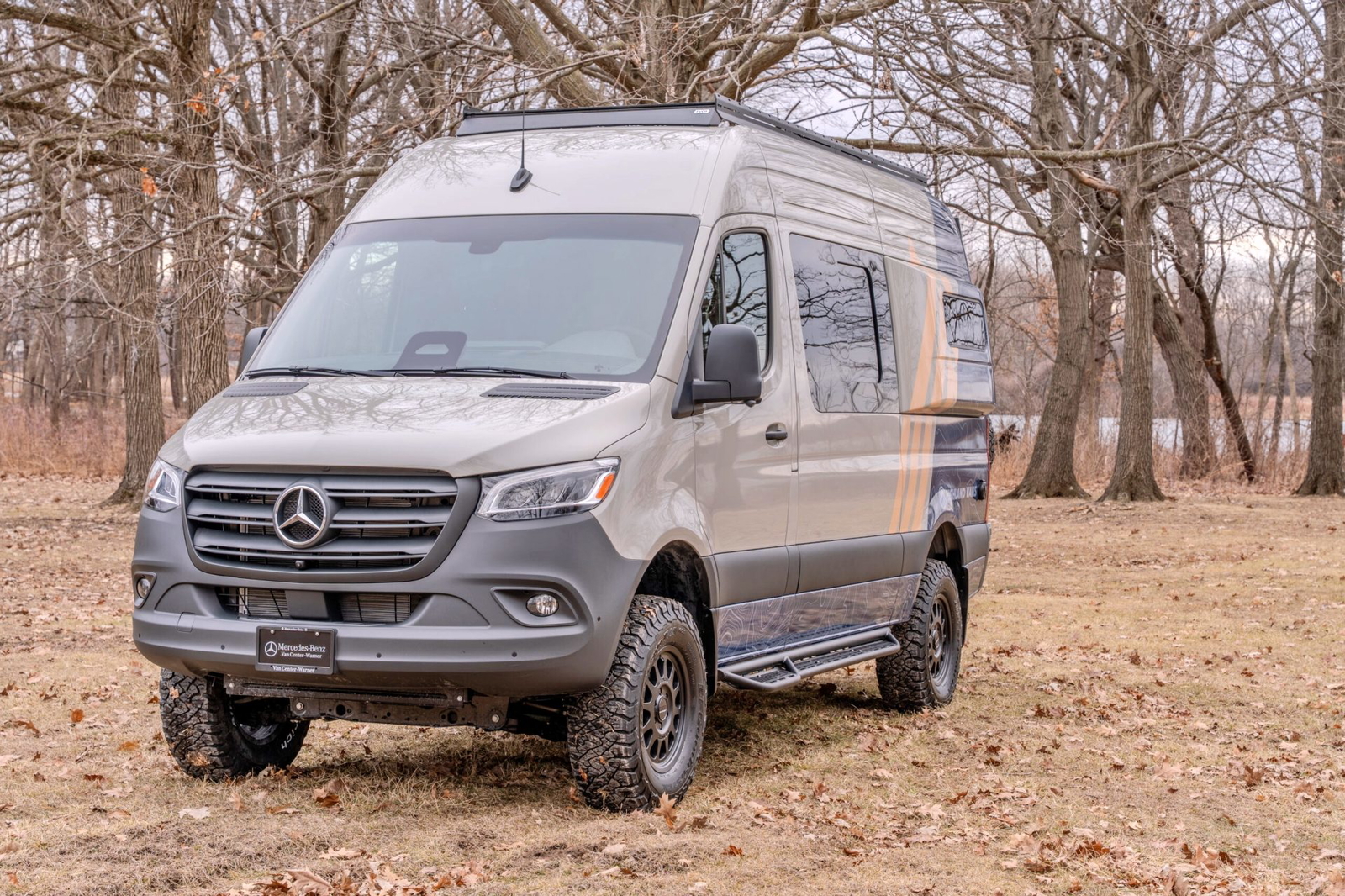 Este caso, tenemos como base una Mercedes-Benz Sprinter 4×4, que ya sale de fábrica lista para comerse el mundo. Esta Sprinter no solo tiene tracción total, también lleva neumáticos todoterreno BFGoodrich para meterse por cualquier sitio, una suspensión mejorada y mayor altura libre. Está claramente pensada para viajar lejos del asfalto.