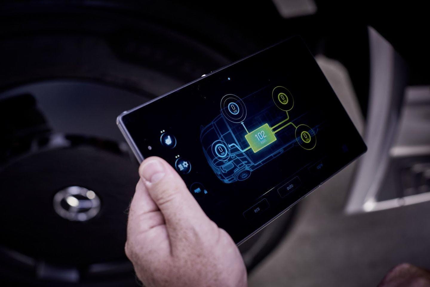 9. Un smartwatch a juego. El conductor del Mercedes eTruck llevará en todo momento un smartwatch, conectado al sistema de infomación del camión. Este reloj le dirá cuanto tiempo queda para que termine la recarga o la autonomía disponible. Mediante la tablet asociada al camión podrá verificar otros parámetros del camión, así como enviar información a su reloj o al gestor de la flota.