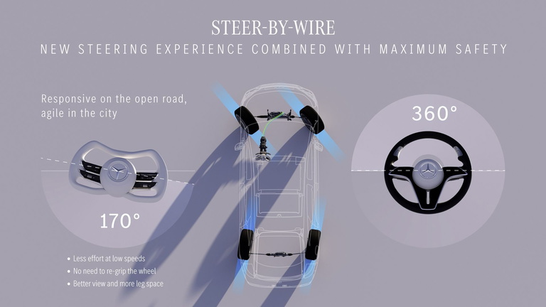 En aquel coche el volante era convencional. De hecho, no es necesario equipar un volante recortado para tener una dirección by-wire. Lo que sí es necesario es acompañar al volante recortado de un sistema de desmultiplicación variable, evitando giros excesivos que conviertan la morfología del volante en una clara desventaja de ergonomía. En maniobras a baja velocidad, el volante del Mercedes EQS nunca girará mas de 170 grados. Hablamos del giro máximo que haríamos en un volante convencional cruzando los brazos.
