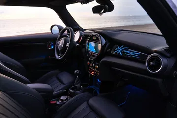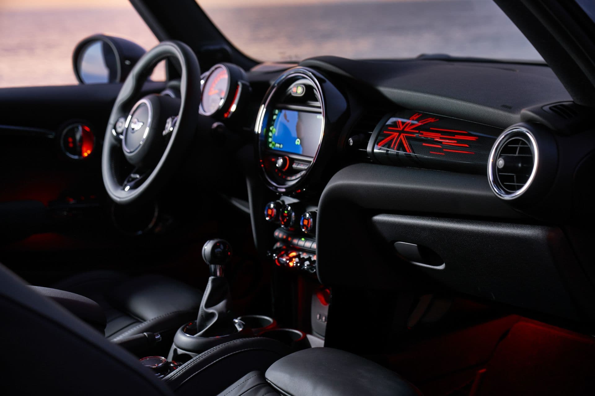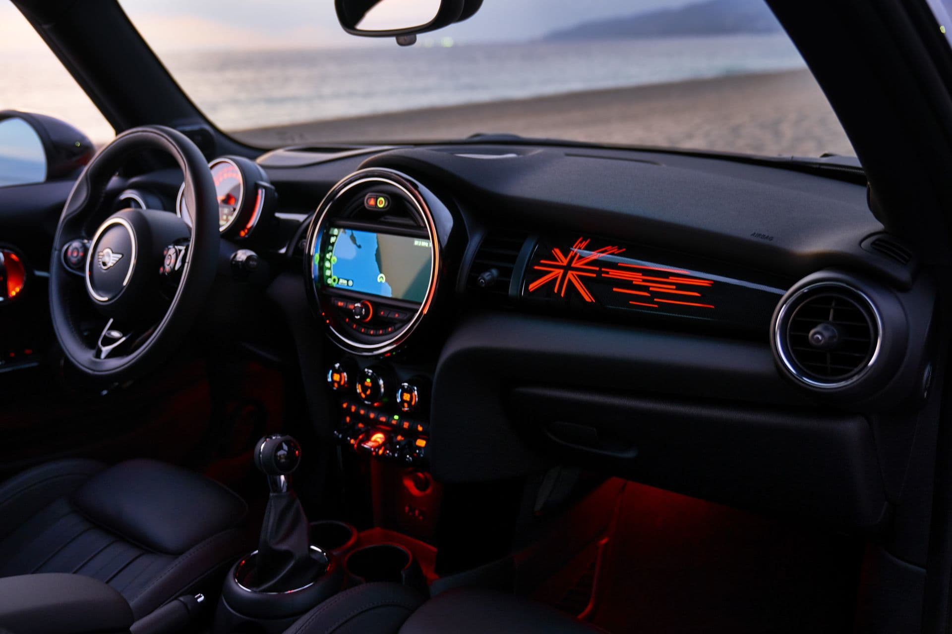 Dentro del coche los cambios son también mínimos. Entre sus novedades encontramos tapizados de cuero Chester en color Malt Brown, y el tapizado Colour Line, disponible en este mismo color. Si somos amantes del Piano Black – y nos gusta pasarnos la vida limpiando con un trapo este tipo de superficies, que atrapan el polvo mejor que ninguna – ahora MINI ofrece la opción de retroiluminar con LEDs estas molduras. Concretamente, con el motivo de la Union Jack británica, en la moldura frente al copiloto. Podemos cambiar el color de esta iluminación de fondo si adquirimos el paquete opcional MINI Excitement.