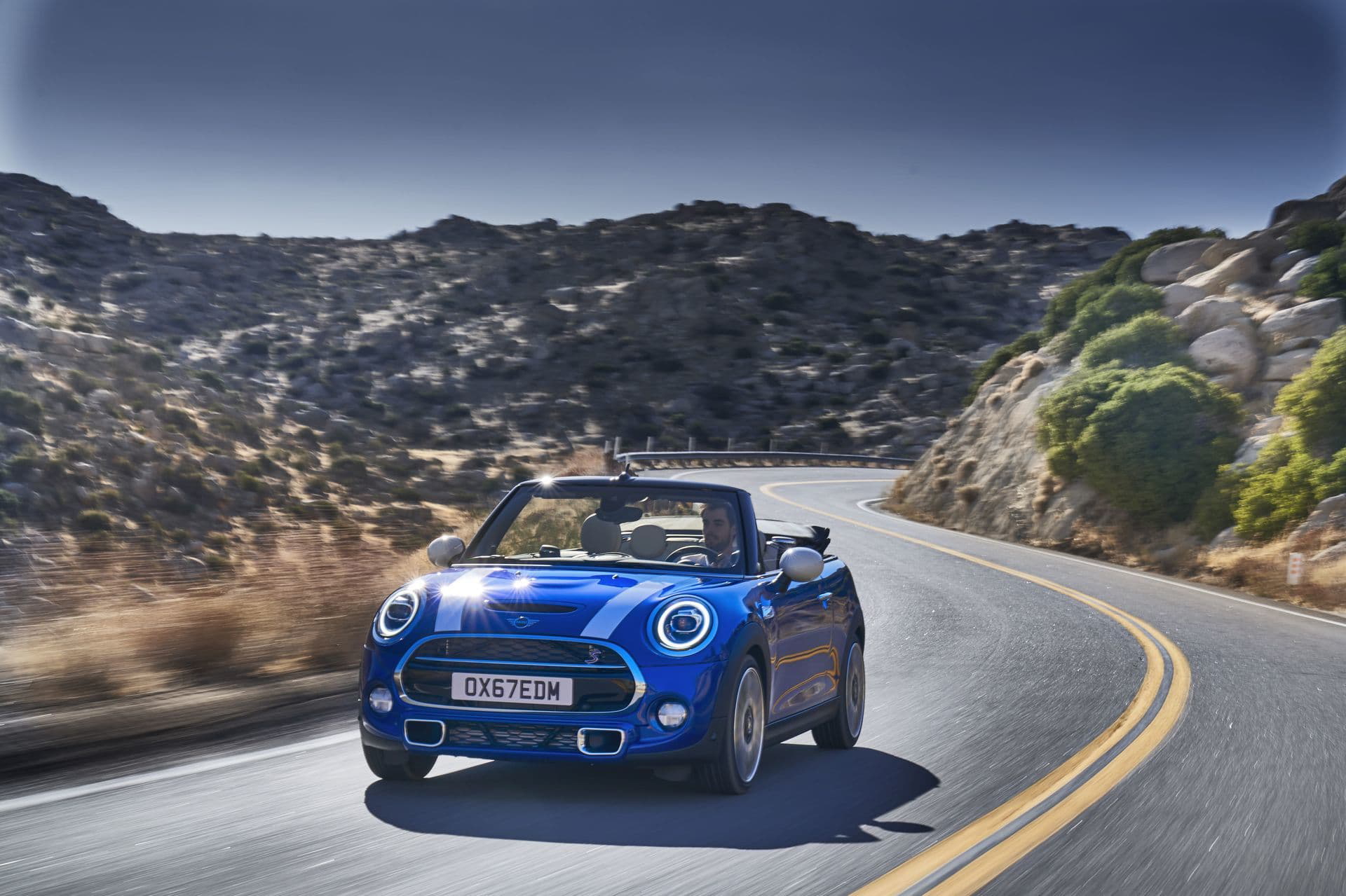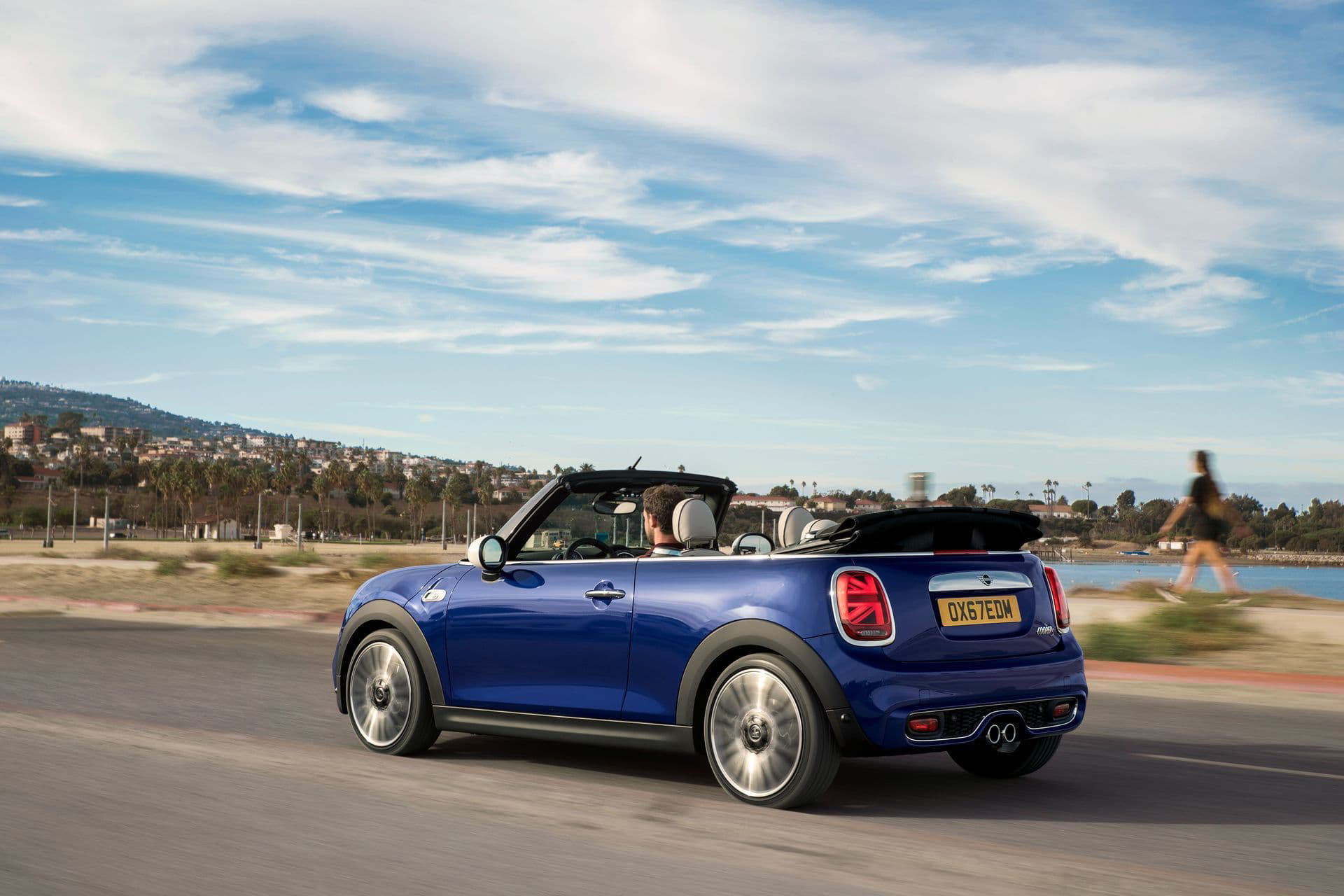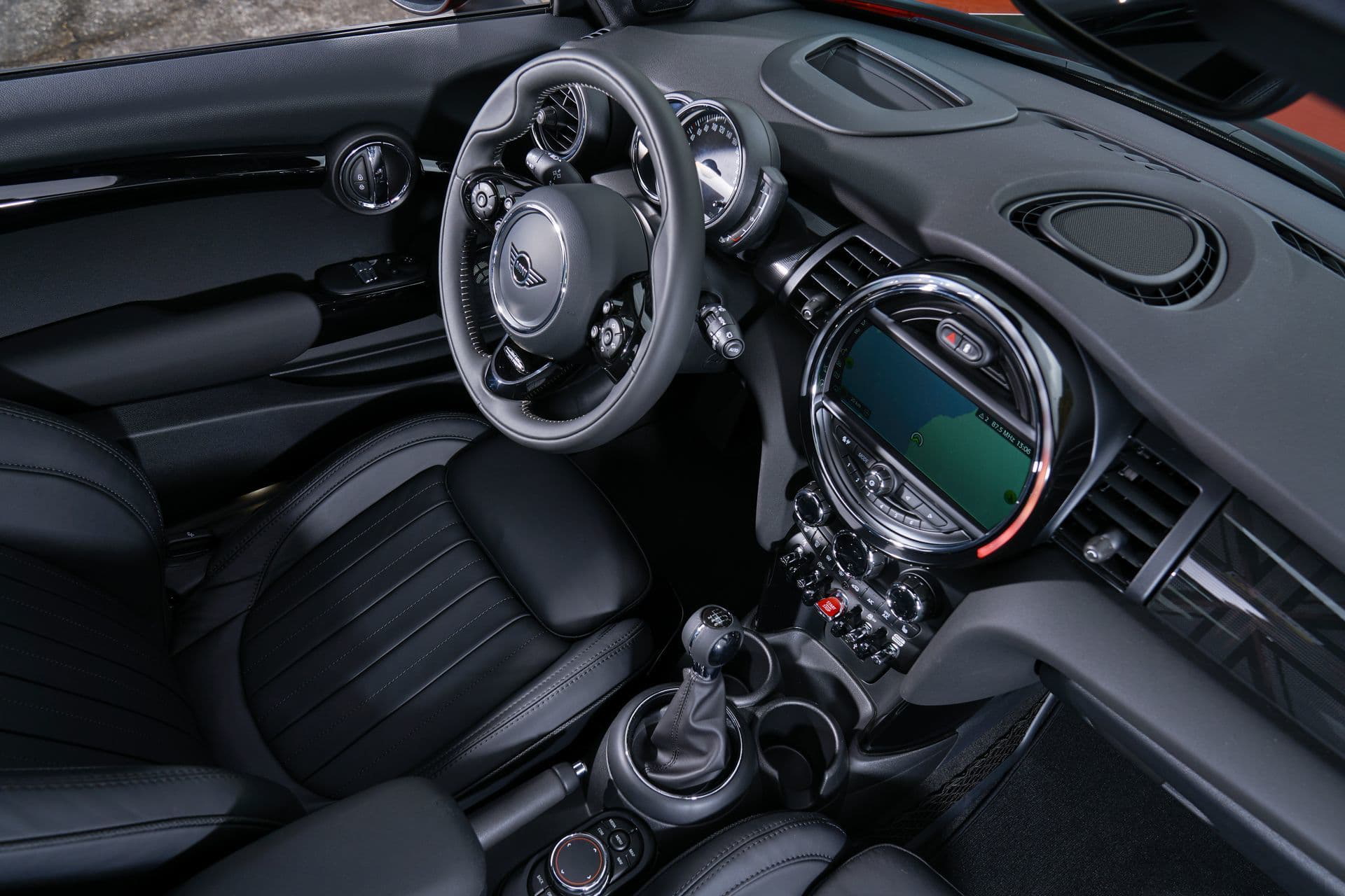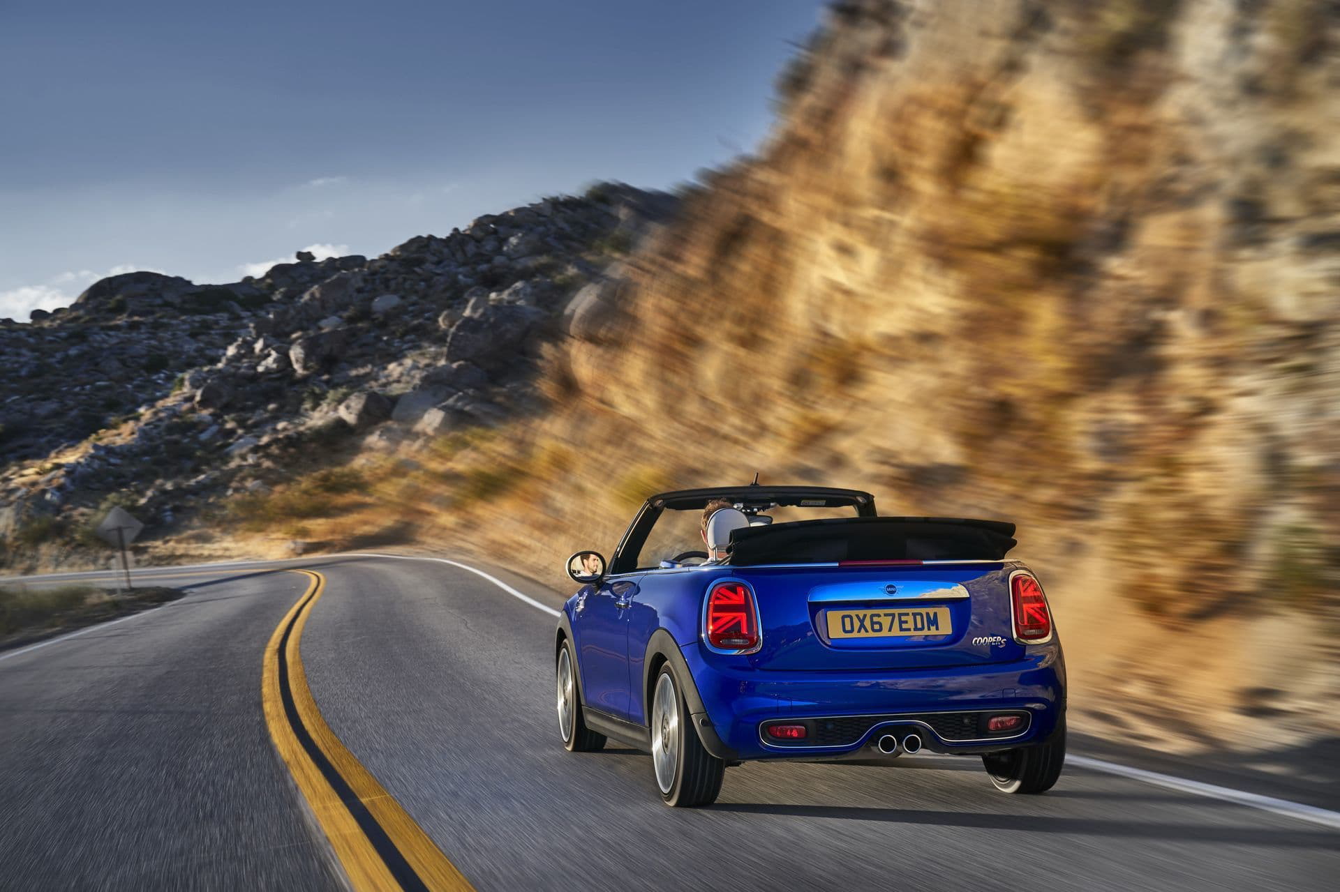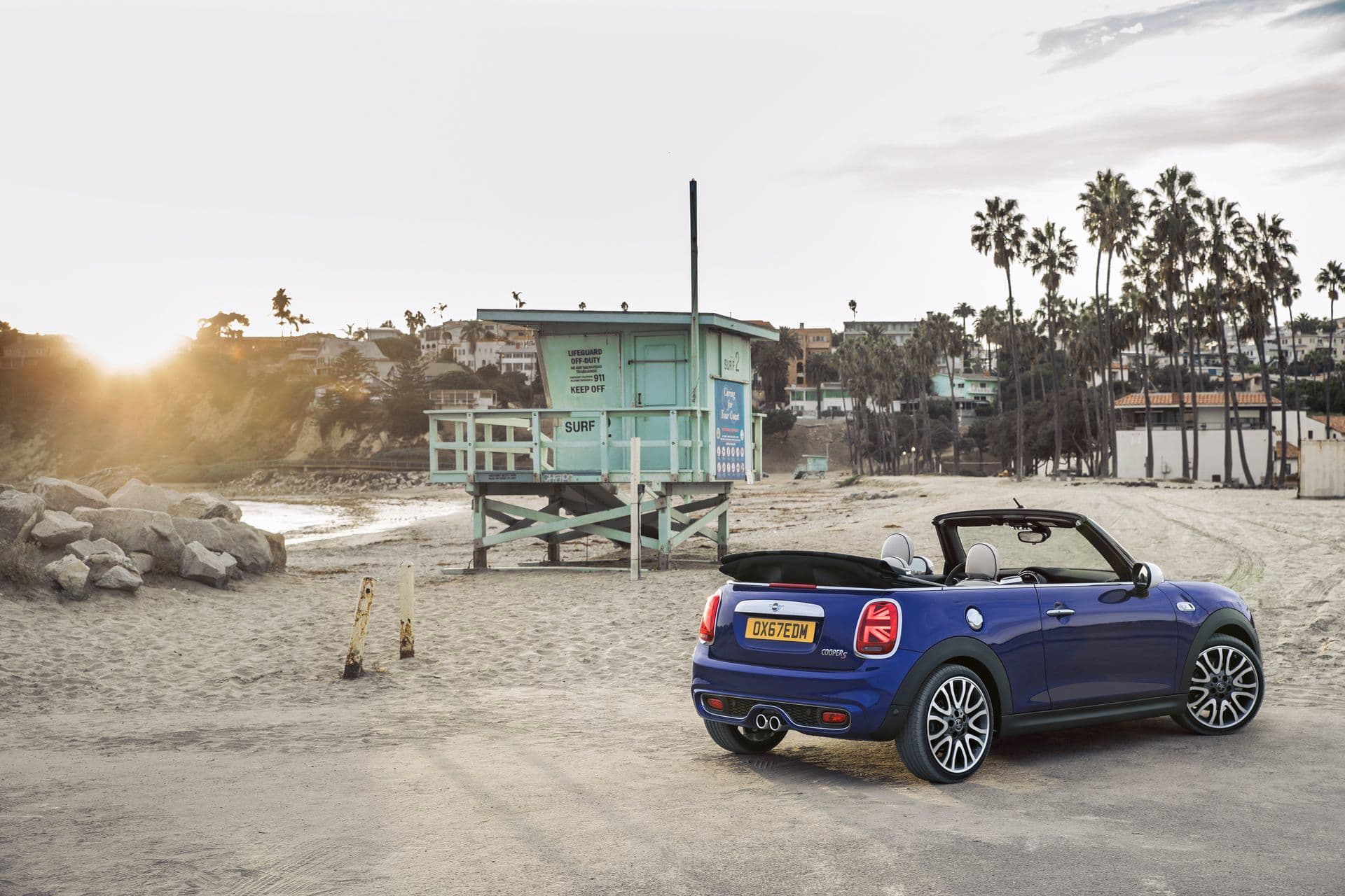 La iluminación diurna sigue siendo cortesía de un aro LED, que rodea la circunferencia de las ópticas al completo. El logotipo de MINI que preside el frontal y las aletas delanteras también ha sido ligeramente modificado – según la marca, ahora es más bidimensional y representa mejor sus valores: la diversión, el diseño, la emoción y la calidad premium. Se estrenan tres nuevas tonalidades para la pintura de estos MINI, llamadas Emerald Grey metalizado, Starlight Blue metalizado – el MINI Cabrio que preside este artículo está pintado en dicho color – y Solaris Orange metalizado.