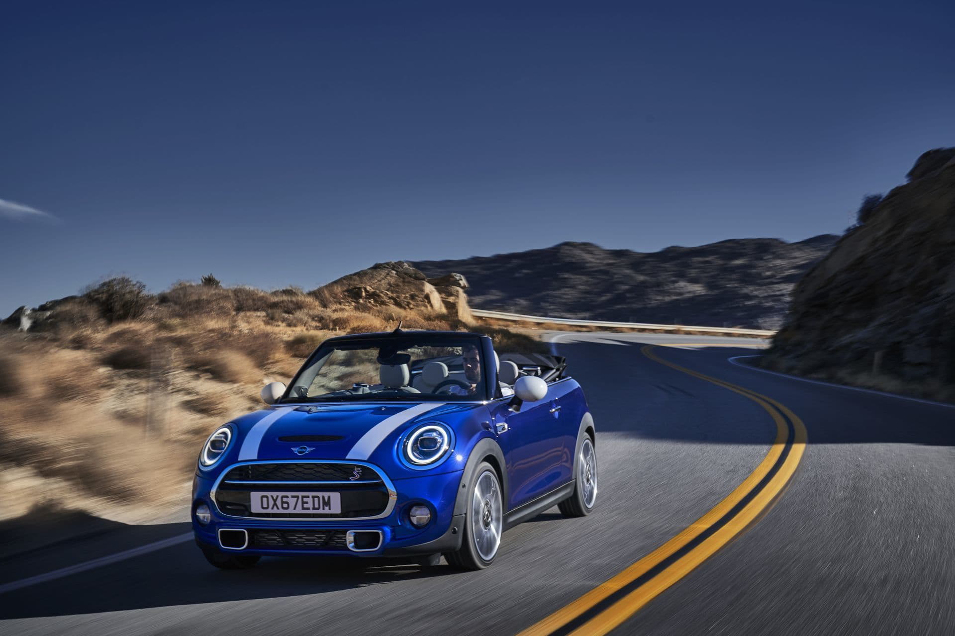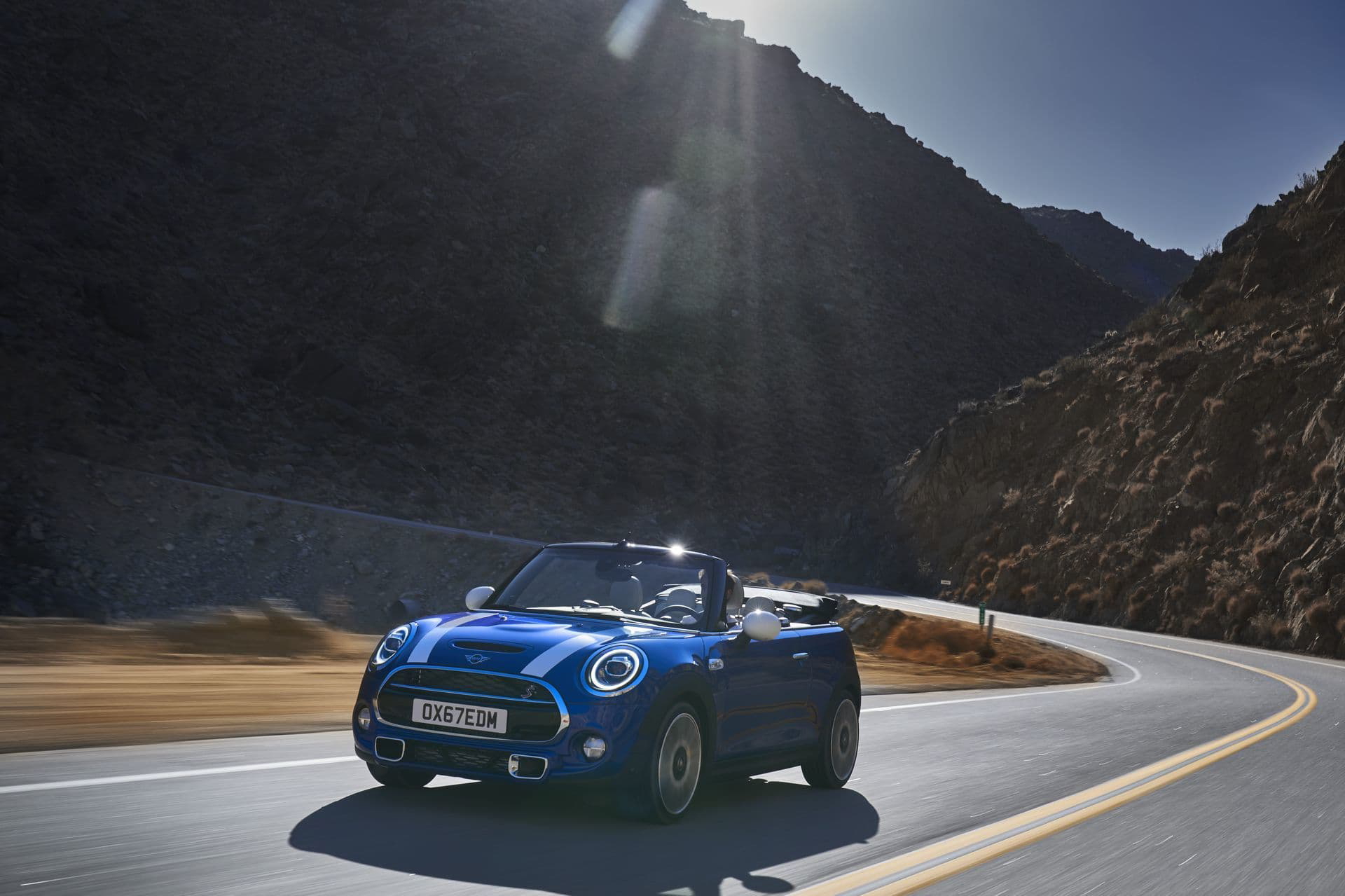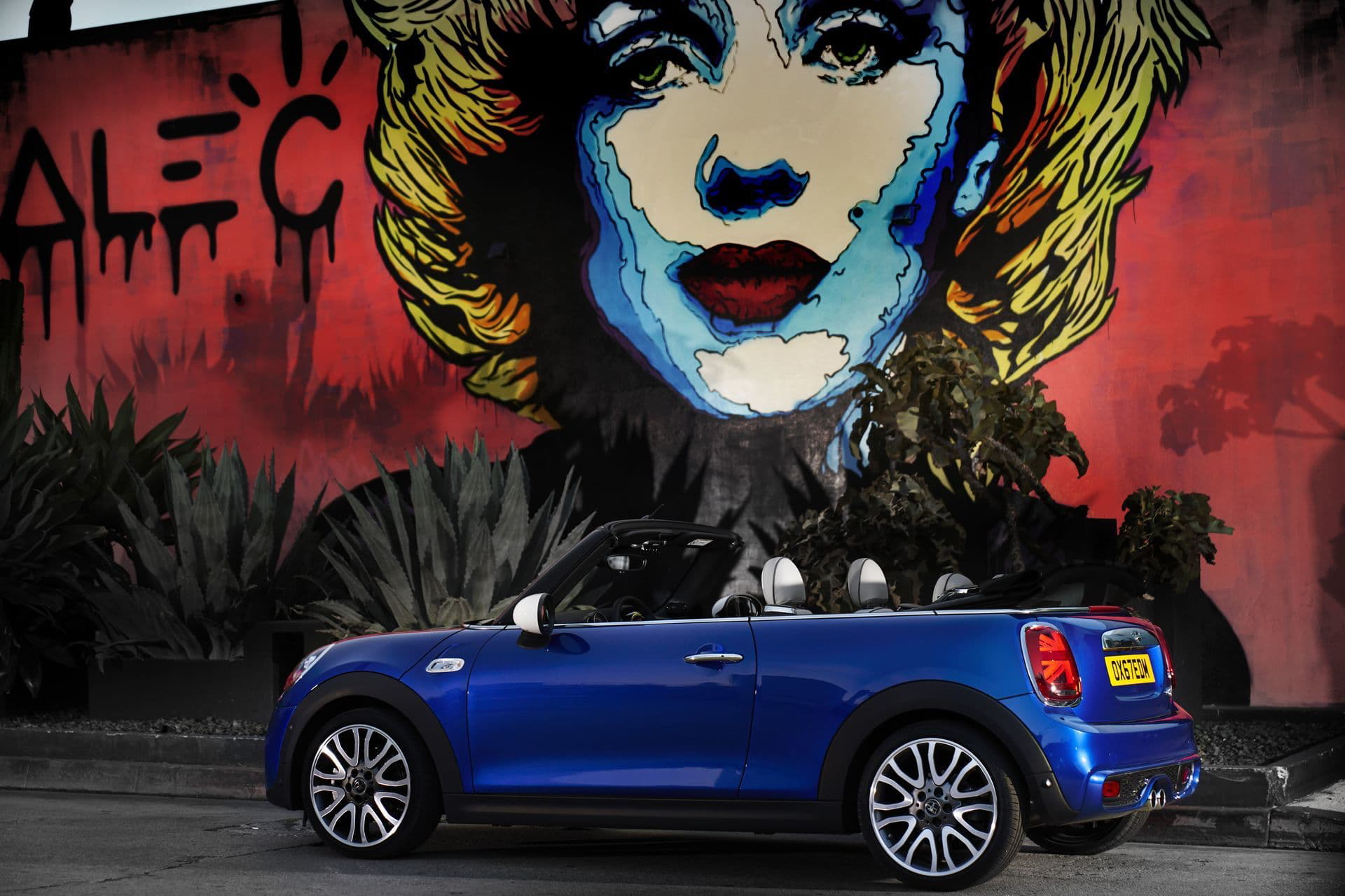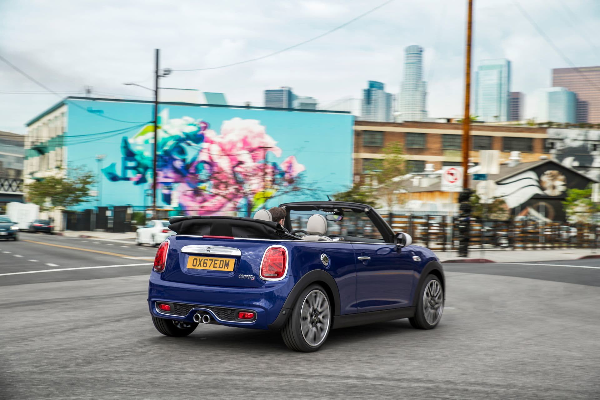 La iluminación diurna sigue siendo cortesía de un aro LED, que rodea la circunferencia de las ópticas al completo. El logotipo de MINI que preside el frontal y las aletas delanteras también ha sido ligeramente modificado – según la marca, ahora es más bidimensional y representa mejor sus valores: la diversión, el diseño, la emoción y la calidad premium. Se estrenan tres nuevas tonalidades para la pintura de estos MINI, llamadas Emerald Grey metalizado, Starlight Blue metalizado – el MINI Cabrio que preside este artículo está pintado en dicho color – y Solaris Orange metalizado.