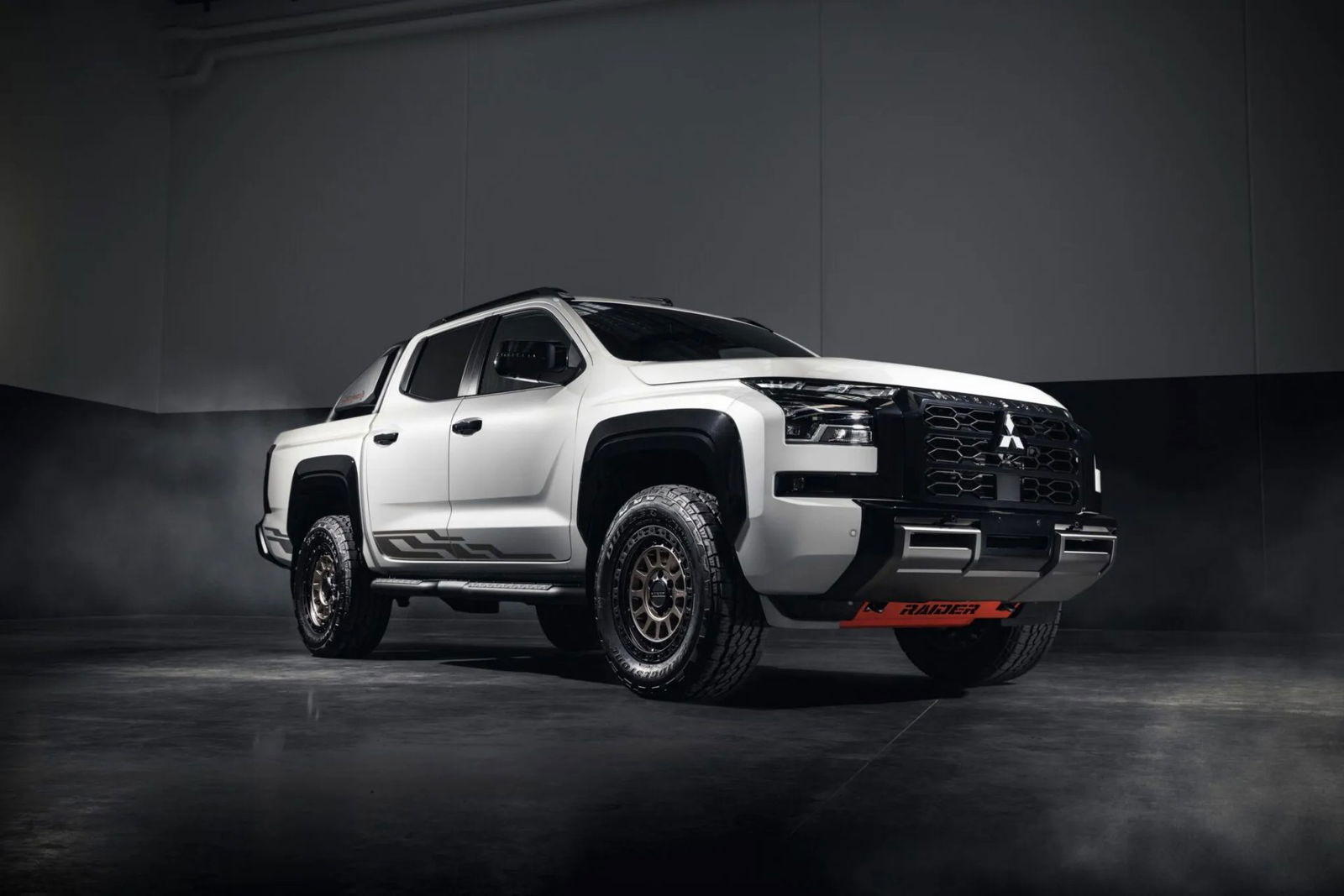 Pero por el momento, Mitsubishi y Premcar quieren tantear el mercado con algo menos radical y bastante más asequible, bautizándola como Triton Raider. Hablamos de una versión especial fruto de 40.000 Km de pruebas, dando como resultado una revisión del sistema de suspensión que incluye nuevos amortiguadores, muelles y topes, un incremento de la altura libre al suelo de 2,5 cm, aumento del ancho de vías de 2 cm, uso de neumáticos Bridgestone Dueler A/T 002 montados sobre llantas Beadlock, estriberas laterales en acero, cubrecárter para motor y transmisión y barras en la caja posterior.
