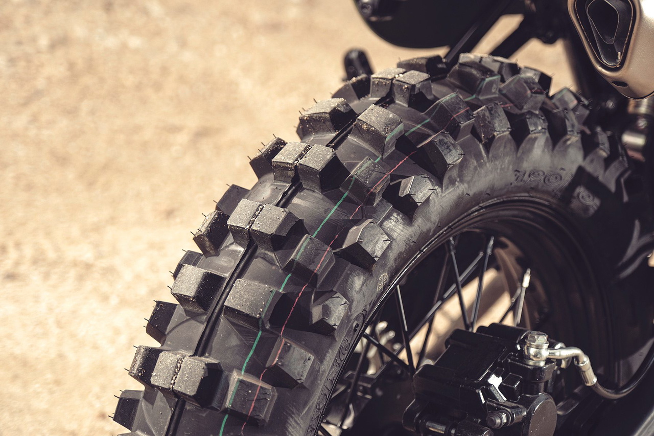 Sus llantas de radio de alambre sirven para absorber mejor los impactos sin quebrarse. Quedan vestidas por unos neumáticos de tacos de 19″ delante y 16″ detrás.
