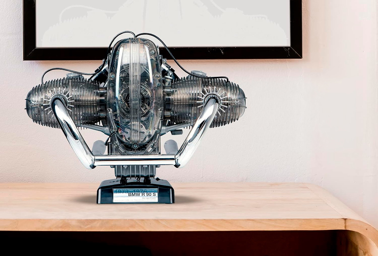 Además de esa carcasa transparente, otra de las características que hace de esta maqueta un adorno perfecto es que cuenta con algunos aportes electrónicos, como es el caso de la iluminación LED que simula la ignición en el interior de los pistones, o como es el caso del sonido real del motor de la BMW R 90 S, que se reproduce gracias a un altavoz integrado.