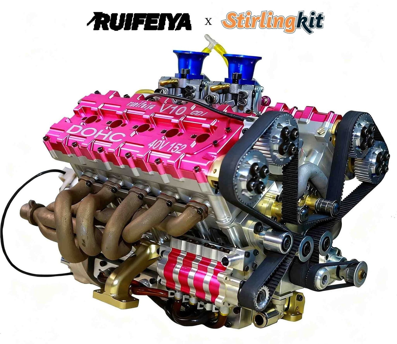 Este motor está fabricado por una empresa china llamada Stirling Kit, especializada en el diseño y producción de motores en miniatura. De hecho, han fabricado todo tipo de mecánicas. Sin embargo, este ha sido su primer V10 en miniatura, del que solo han producido 20 unidades. Puede parecer un motor simple, pero su construcción es muy similar a la de un V10 de producción a escala real – como los que podíamos encontrar en un Audi R8. Tiene cuatro válvulas por cilindro y está alimentado por dos carburadores.