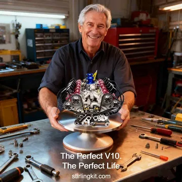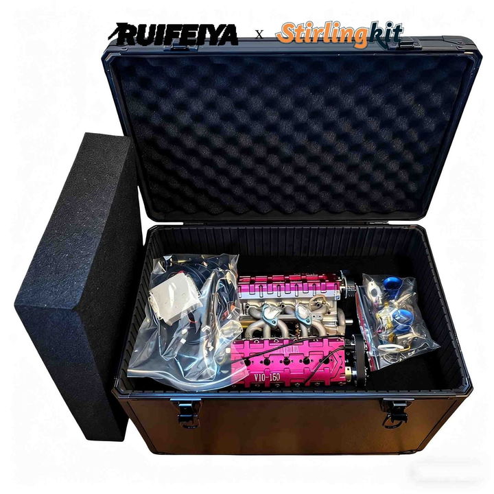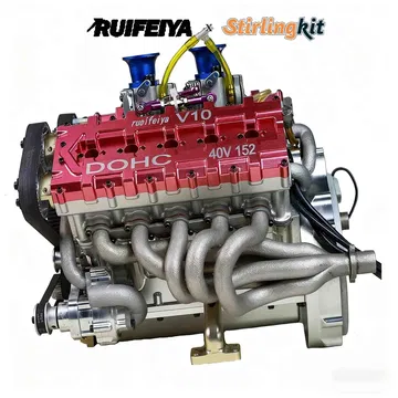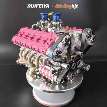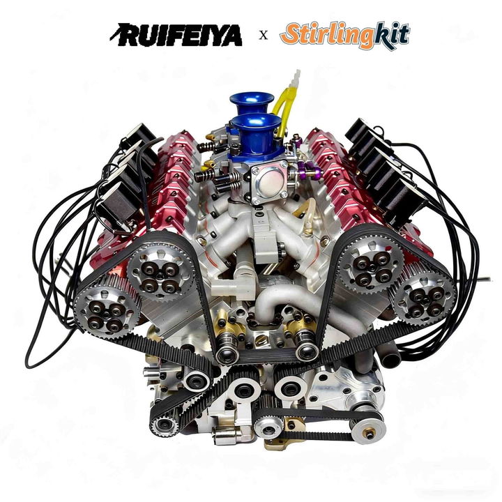 Este motor está fabricado por una empresa china llamada Stirling Kit, especializada en el diseño y producción de motores en miniatura. De hecho, han fabricado todo tipo de mecánicas. Sin embargo, este ha sido su primer V10 en miniatura, del que solo han producido 20 unidades. Puede parecer un motor simple, pero su construcción es muy similar a la de un V10 de producción a escala real – como los que podíamos encontrar en un Audi R8. Tiene cuatro válvulas por cilindro y está alimentado por dos carburadores.