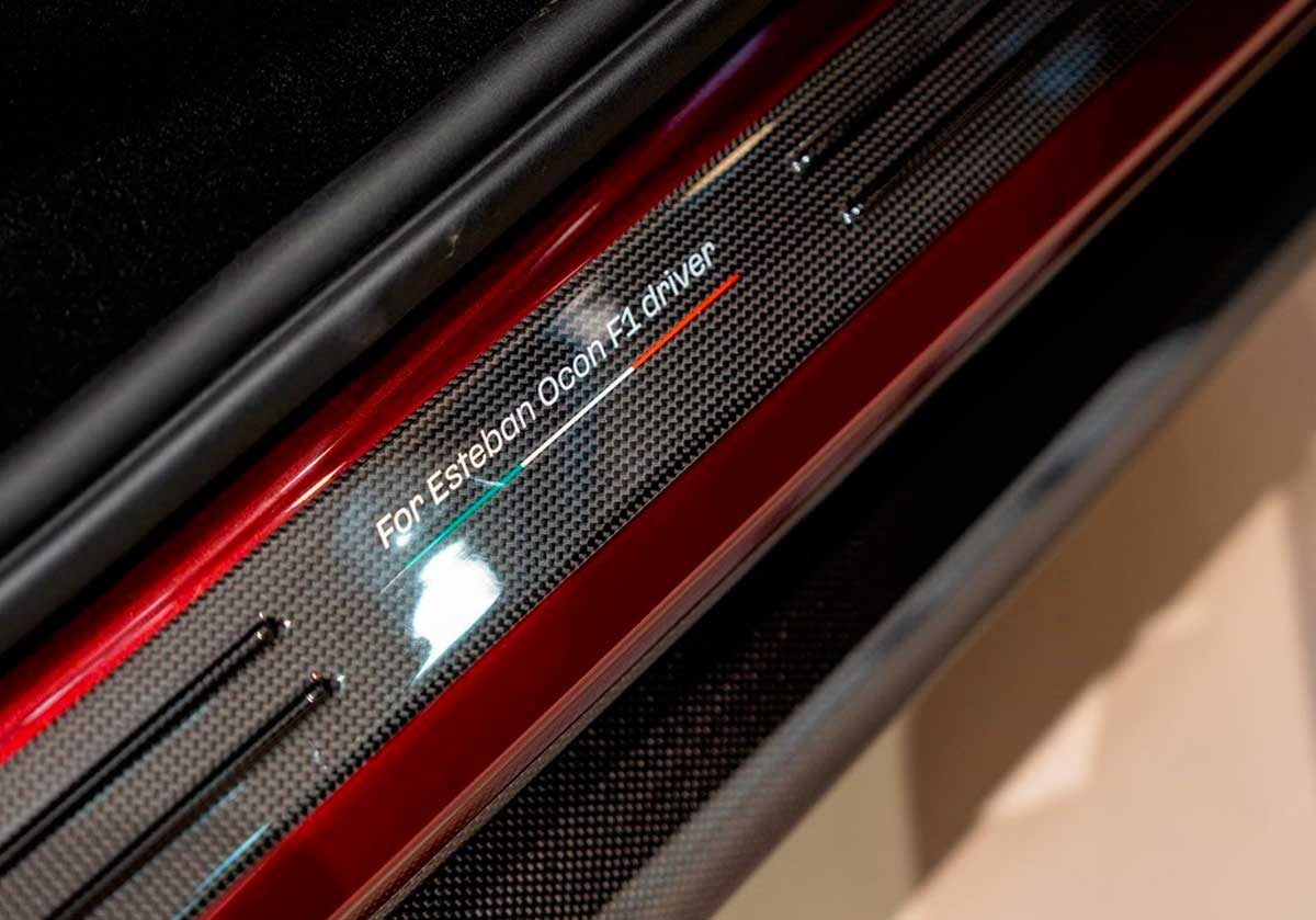Por dentro, la unidad de Ocon viene equipada con asientos de carbono tipo bacquet, y el umbral de las puertas luce una placa personalizada con el nombre del piloto grabado en fibra de carbono. Vamos, que no es un Ferrari de catálogo sino una configuración a medida que eleva tanto el precio como la exclusividad.