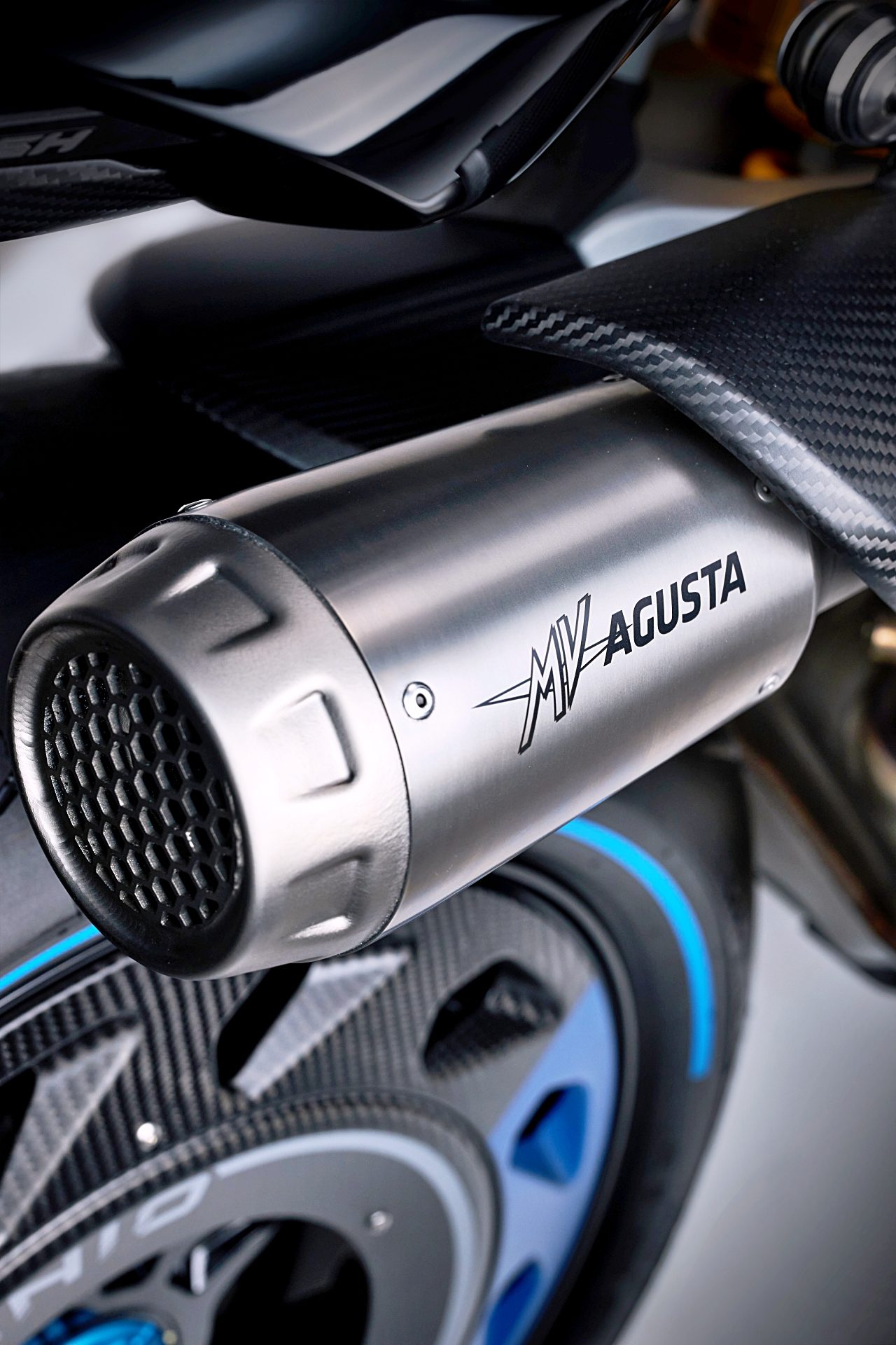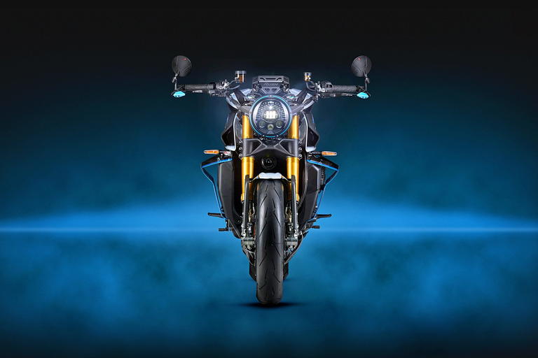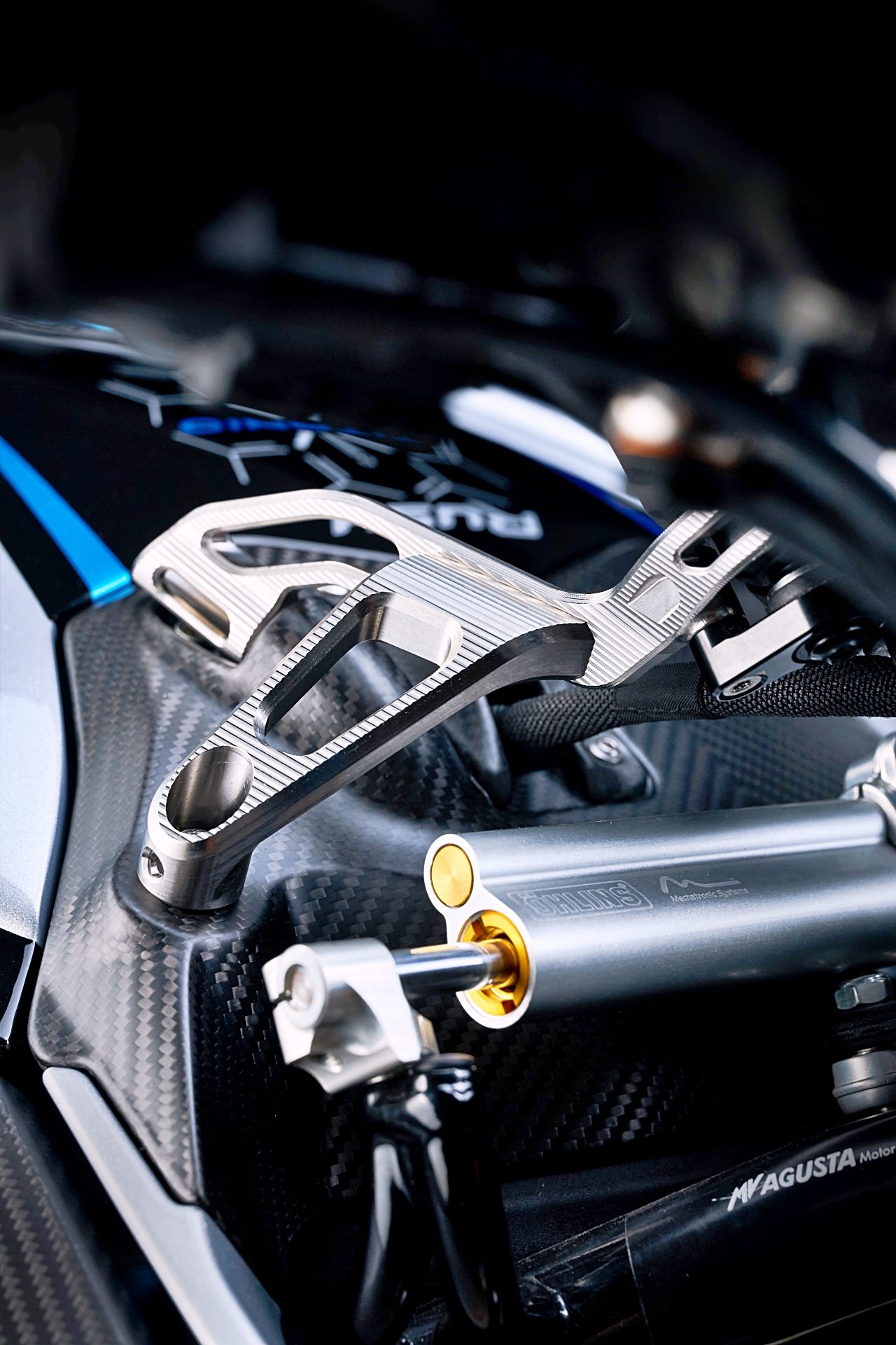 Por su parte, las tapas del motor, los paneles laterales, los guardabarros y la nueva cubierta de la rueda trasera son de fibra de carbono. Y a esto se suman múltiples detalles en aluminio anodizado de color azul, como la tuerca de la rueda trasera, la tapa del piloto trasero, la cubierta del faro, el tapón del depósito o los protectores de manetas.