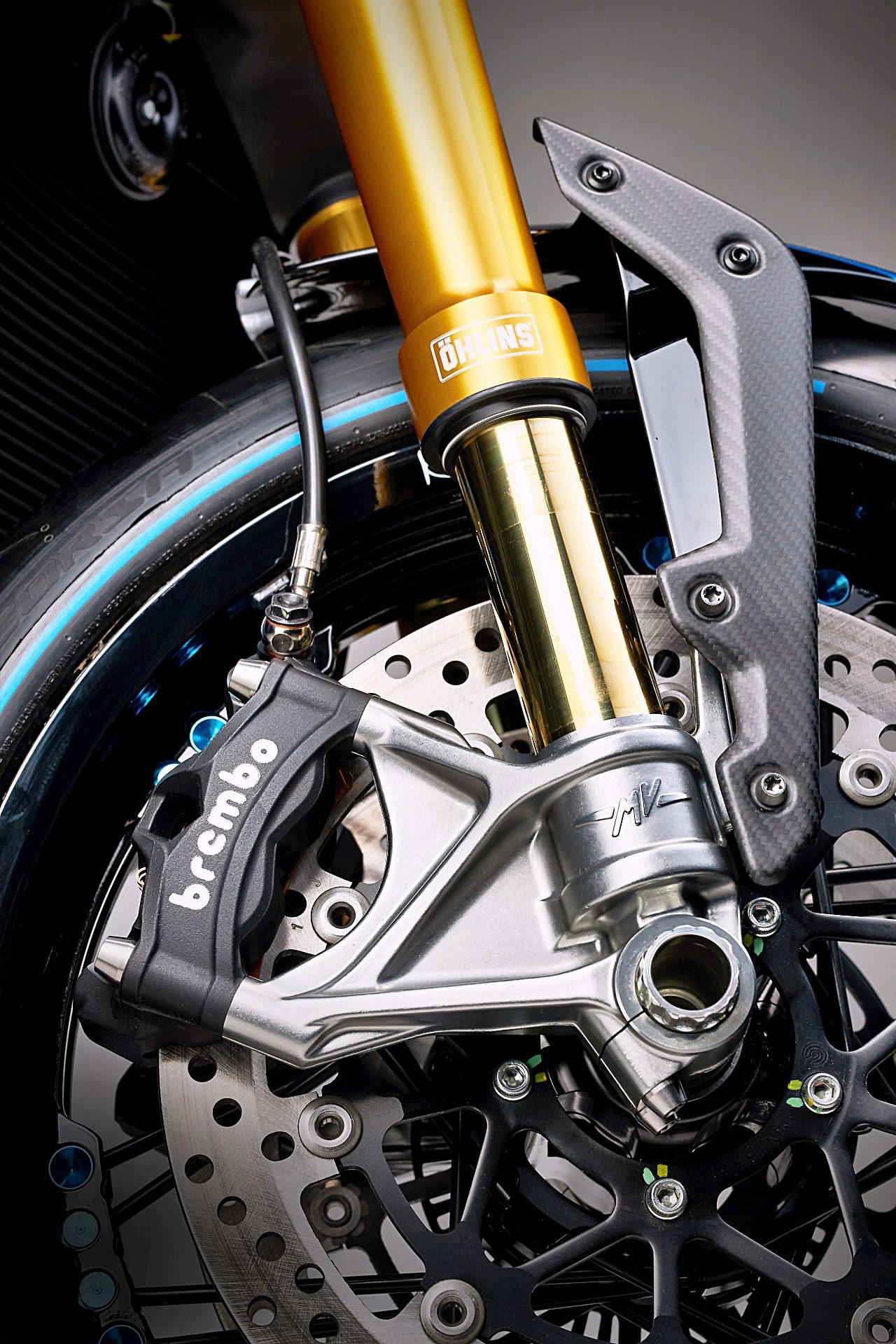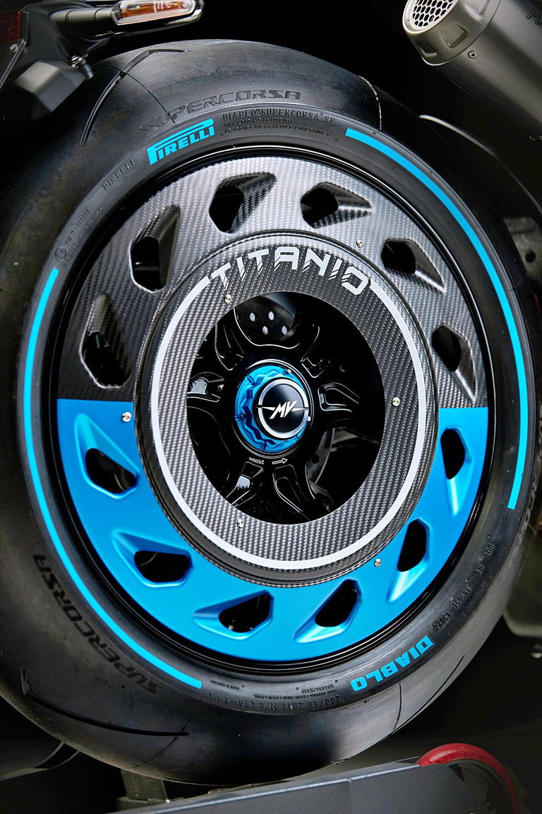 Se mantiene la icónica configuración de ruedas, con llanta delantera normal de radios y la trasera con cubierta de carbono (aunque la llanta es de aluminio forjado). En cuanto al equipo de frenos, confía en dos discos de 320 mm con pinza de 4 pistones para la rueda delantera y un disco de 220 mm con pinza de 2 pistones en la trasera. Todo de Brembo.
