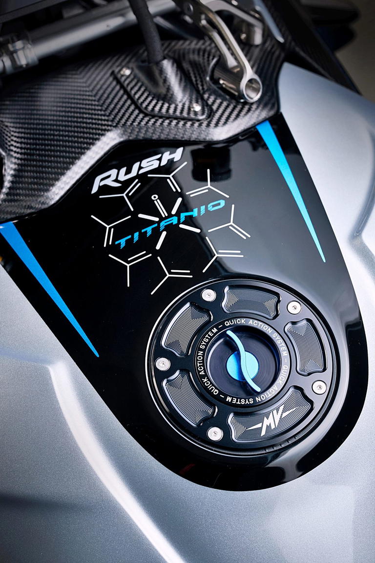 En el corazón de la Rush Titanio se encuentra el conocido motor de cuatro cilindros en línea de 1.000 cc de MV Agusta, ahora adaptado a la normativa Euro 5+. Tiene nuevos árboles de levas, una gestión electrónica revisada, mayor sensibilidad del acelerador, relaciones de cambio optimizadas y un desarrollo final más corto para mejorar la aceleración y la respuesta. Con estas mejoras, el motor ofrece una mejor respuesta a bajo régimen, con un funcionamiento más suave y con menos vibraciones.