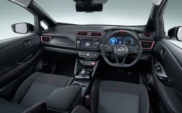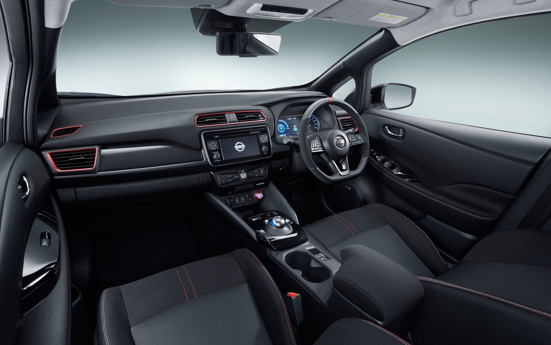 En el interior del coche NISMO ha instalado unos asientos deportivos con mayor agarre lateral. También podemos encontrar detalles en color rojo en las salidas de aireación, así como una marca de color rojo en la parte superior del volante, ahora ligeramente achatado. A nivel de tren de rodaje, NISMO afirma haber equipado a este compacto eléctrico con una suspensión rebajada de tacto más firme, así como con una unidad de control electrónico de motor mejorada. No se ha explicitado que el Leaf NISMO desarrolle una potencia por encima de los 150 CV del coche de serie, pero sí habrá cambios en la entrega de potencia.