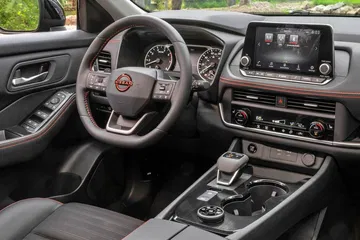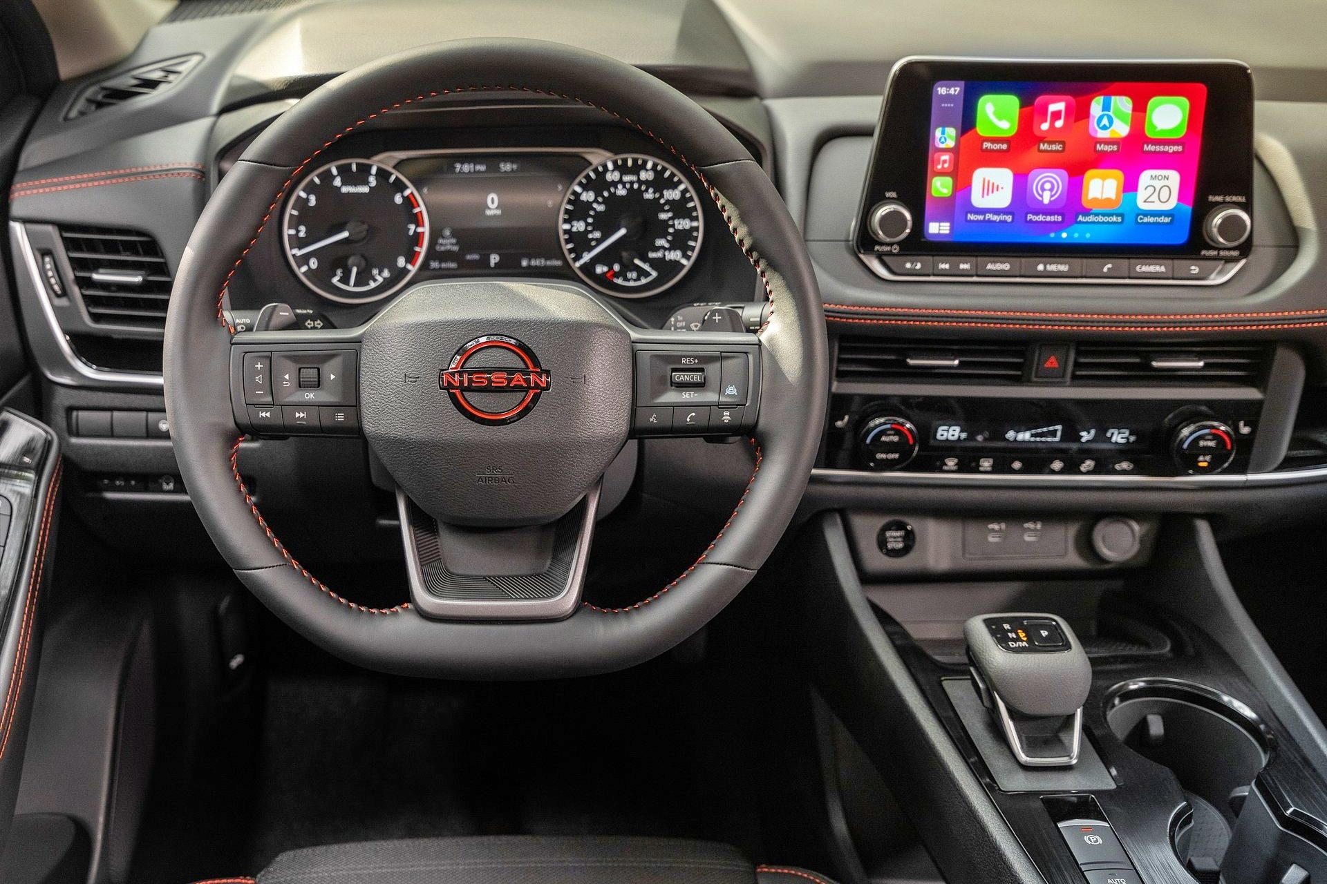 En el habitáculo, el Rock Creek también ofrece algunas diferencias que lo desmarcan de la versión normal del Rogue. Los asientos, tapizados en cuero sintético resistente al agua, cuentan con calefacción de serie y un diseño exclusivo con costuras en contraste en color Lava Red, a juego con los detalles exteriores. A esto se suma un sistema de visión periférica inteligente 3D HD con función de vista off-road, que permite detectar obstáculos alrededor del vehículo hasta 20 km/h, algo especialmente útil en caminos estrechos o con poca visibilidad.