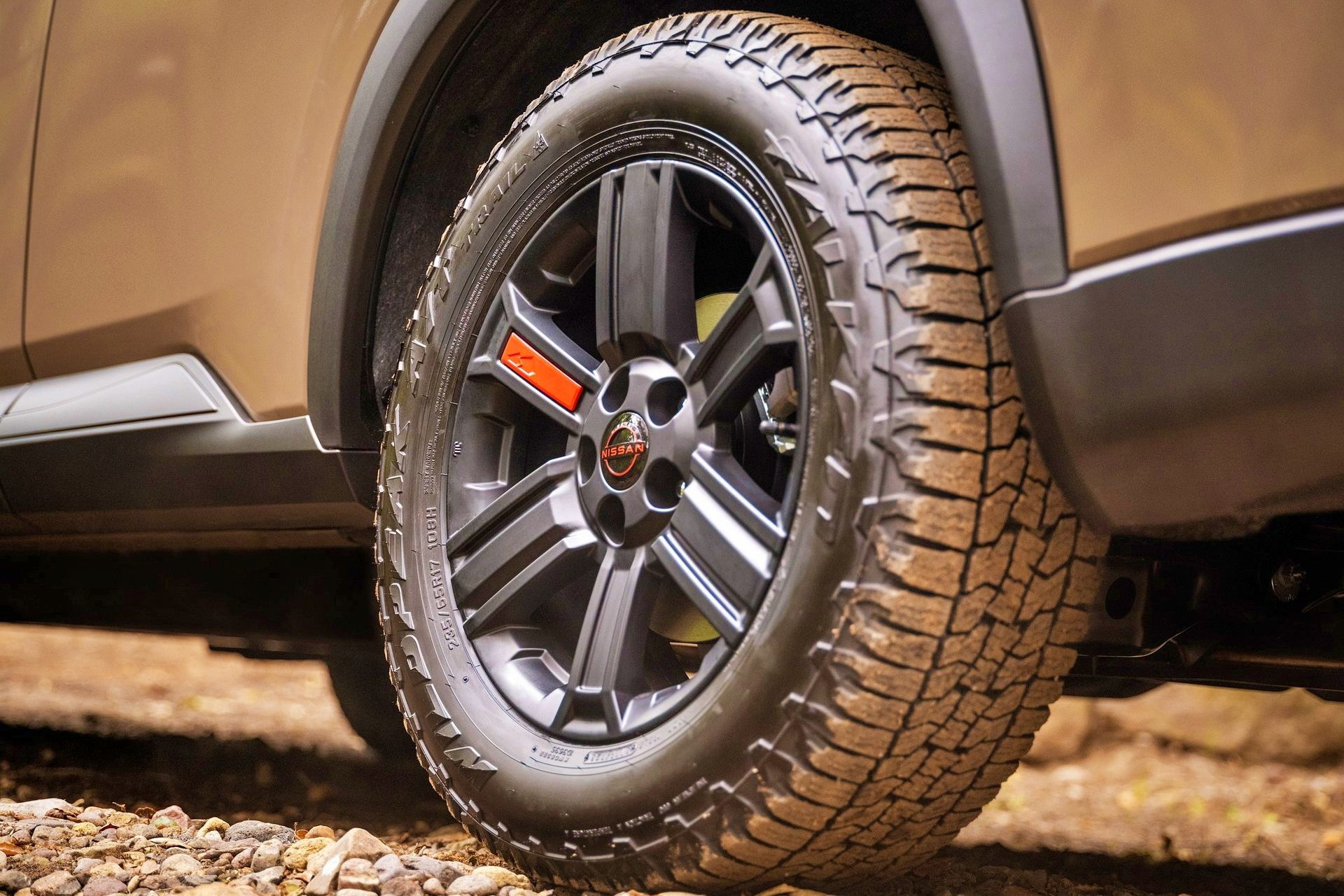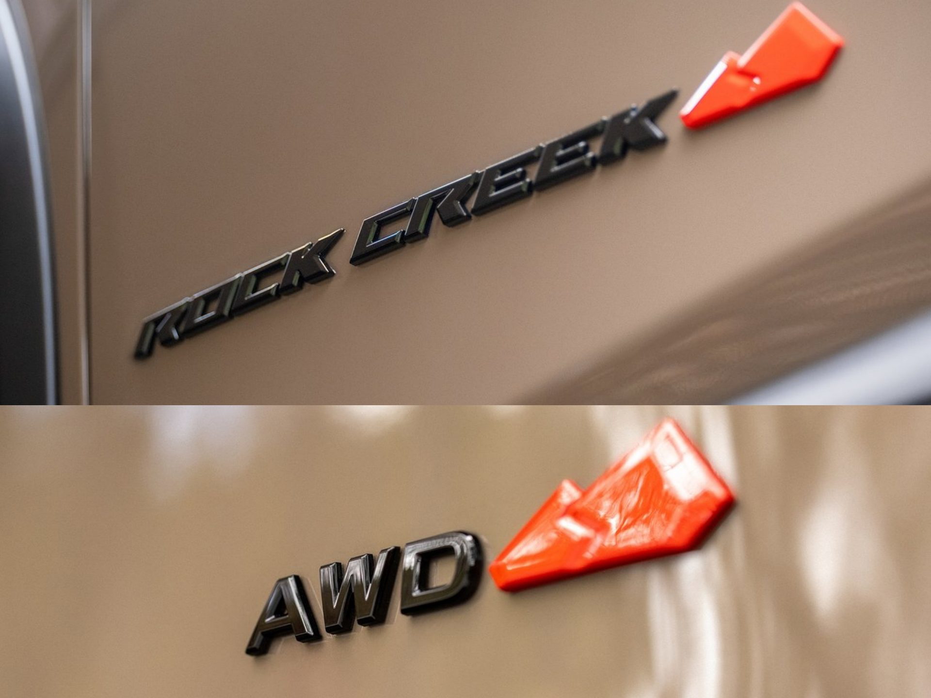 Entre los elementos que más llaman la atención del Rock Creek destaca su parrilla delantera acabada en negro piano, rematada con detalles plateados que acentúan su robustez visual. A ello se suman detalles decorativos en un intenso color Lava Red (presentes en el logotipo frontal, el splitter, los retrovisores y las barras del techo) que subrayan su carácter off-road. Este mismo color aparece también en las llantas de aleación ligera de 17 pulgadas, que para los estándares actuales son de pequeño tamaño, pero muy acertado para salir del asfalto. Están acabadas en color negro satinado y envueltas con unos neumáticos específicos para todoterreno: unos Falken Wild Peak en medidas 235/65R17.