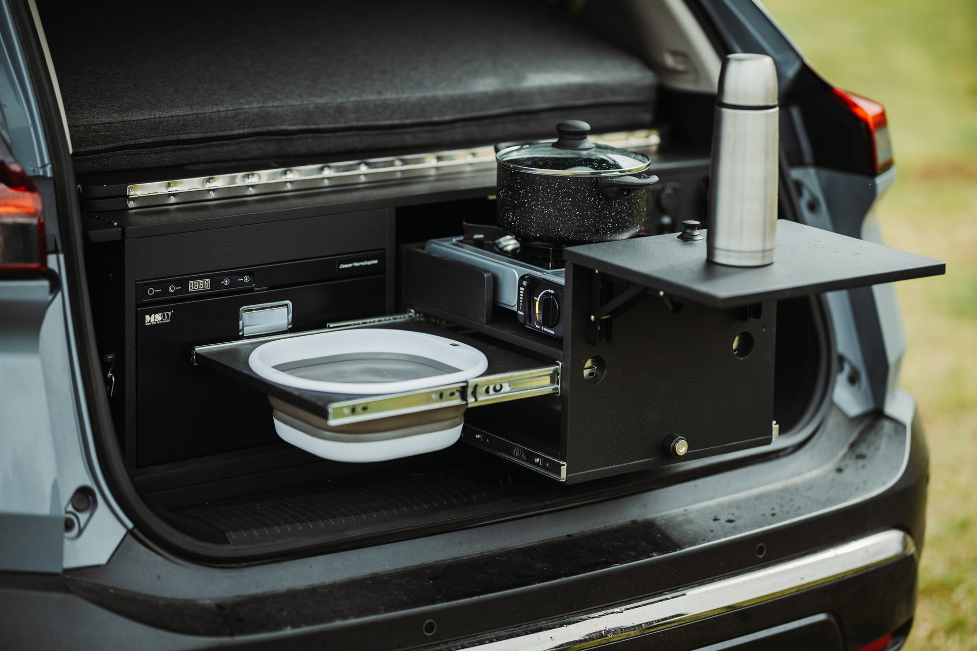 - Autosuficiencia para acampar, con una tienda de campaña de techo y colchón de 160 centímetros por 200 centímetros, lateral extensible con iluminación LED, nevera de 18 litros, fregadero, hornillo de gas, ducha exterior, depósito con manguera, cargador de batería con enchufe y tomas de corriente